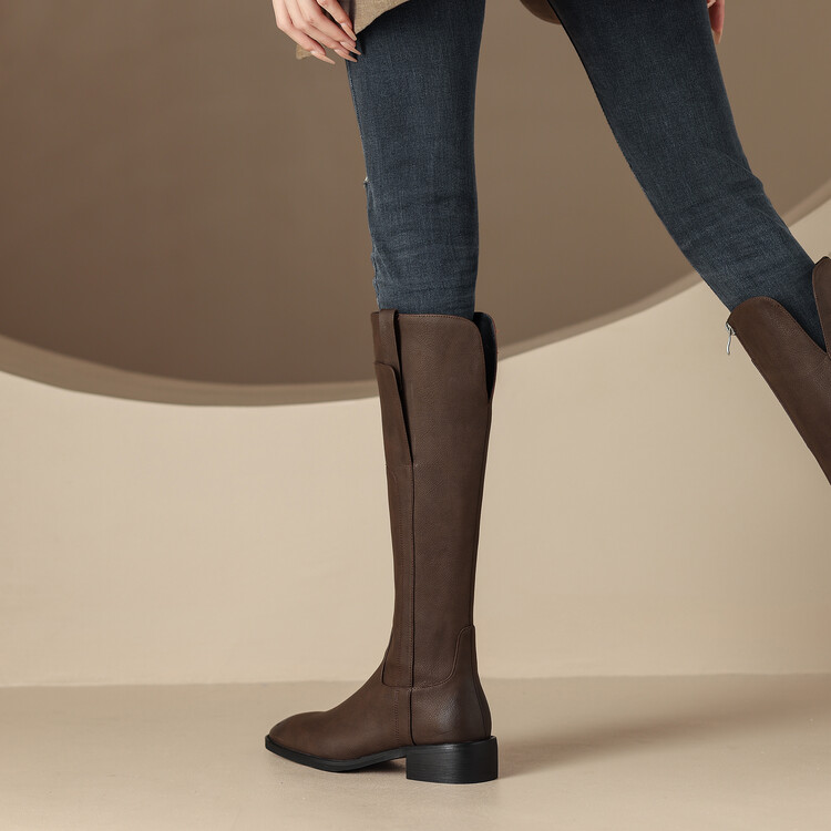 骑士靴真皮方头中跟高筒不过膝