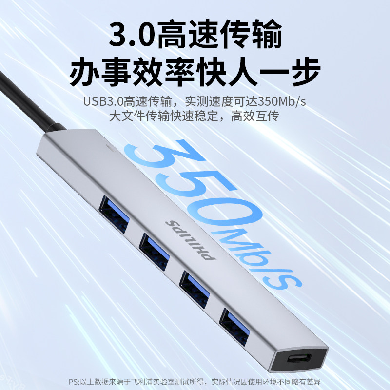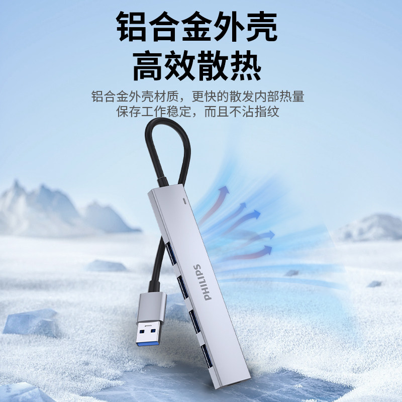 飞利浦usb扩展器3.0合金外接笔记本电脑插头多接口转换usb转接头多功能hub集线器一拖四usp多口高速分线器