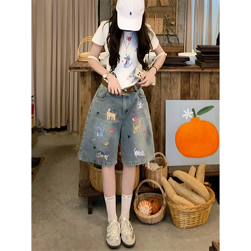 大码复古小狗图案设计阔腿五分牛仔裤女秋冬新款高腰宽松显瘦中裤