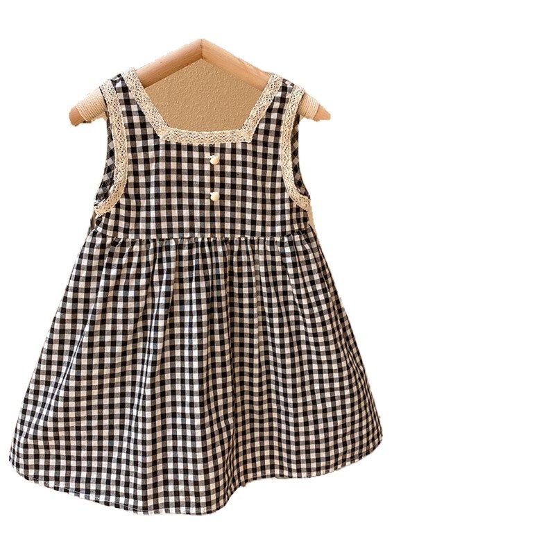 女童罗马假日连衣裙夏装新款洋气中小童格子公主裙蕾丝边背心裙子