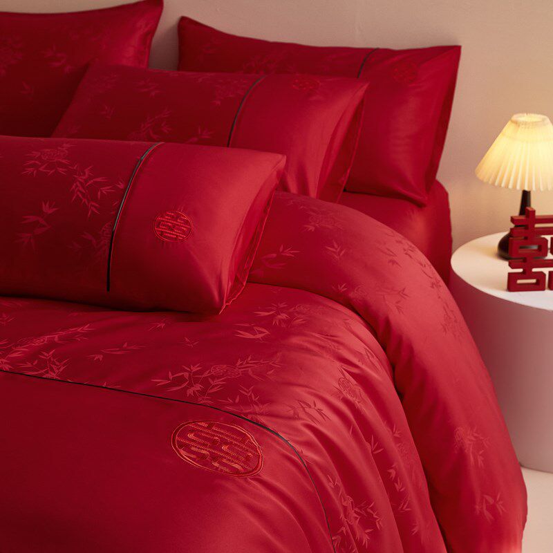 新中式大红色水洗棉提花婚庆四件组结婚陪L嫁喜被新婚床单床上用