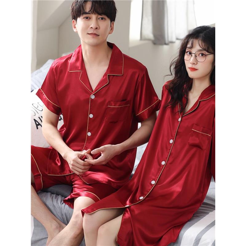 2套价 情侣睡衣冰丝夏季新婚短袖红色家居服女士开衫结婚男款套装