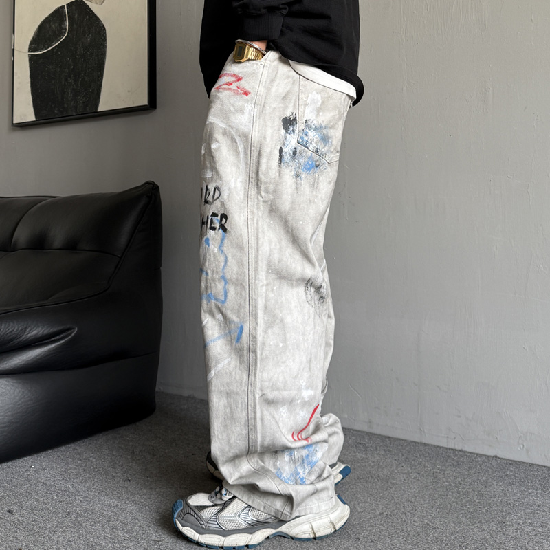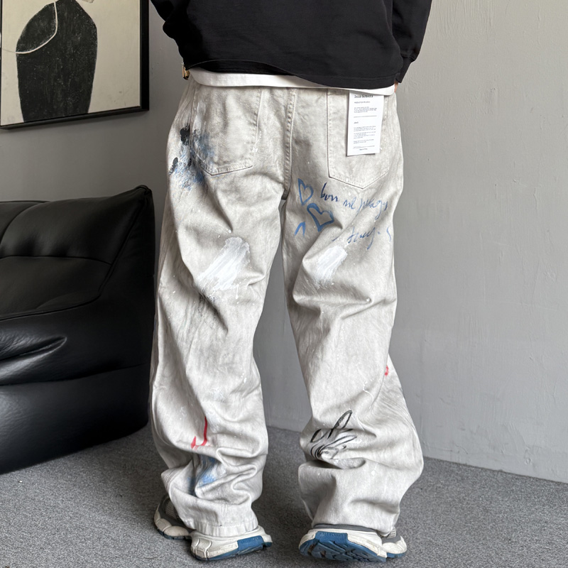 春季美式休闲痞帅涂鸦彩绘复古做旧牛仔裤男直筒宽松高街阔腿裤子