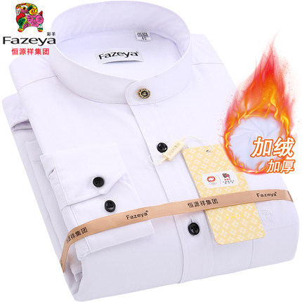 恒源祥彩羊圆领保暖白衬衫男冬季加厚加绒纯白色中华立领保暖衬衣