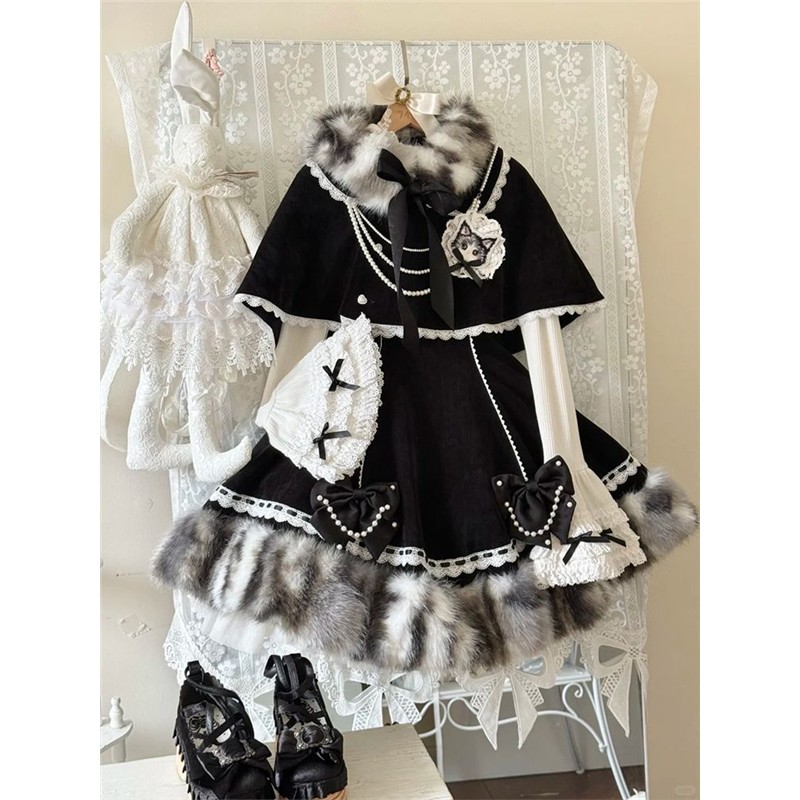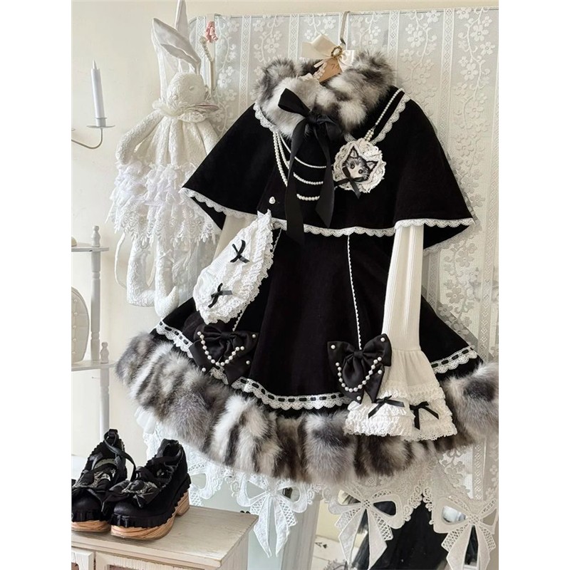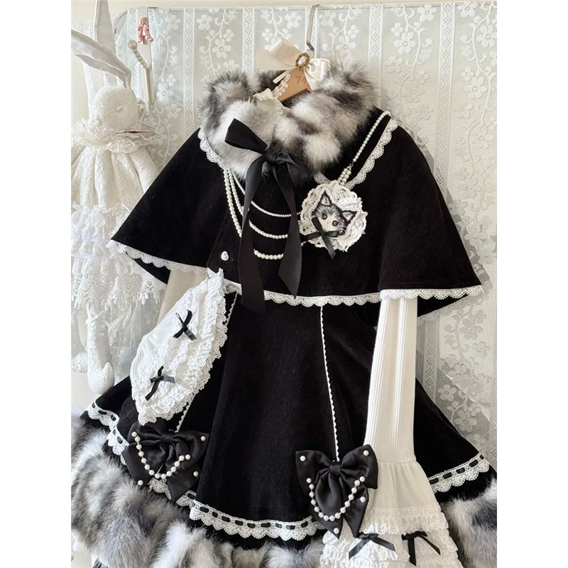 甜美洛丽塔设计感斗篷+蝴蝶结连衣裙+打底内搭三件套装