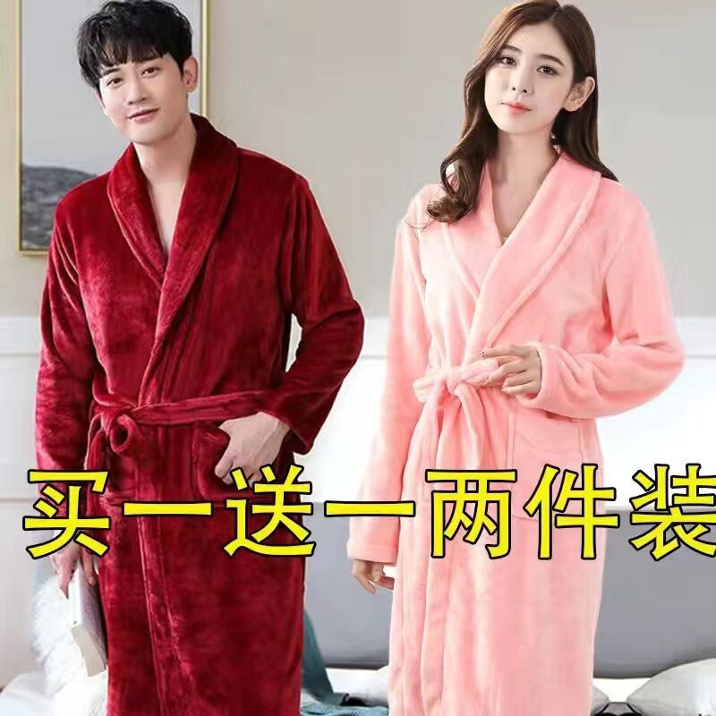 情侣浴袍买一送一睡袍男秋冬双面绒保暖珊瑚绒中长小个子浴衣女
