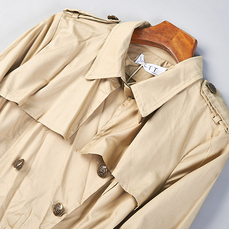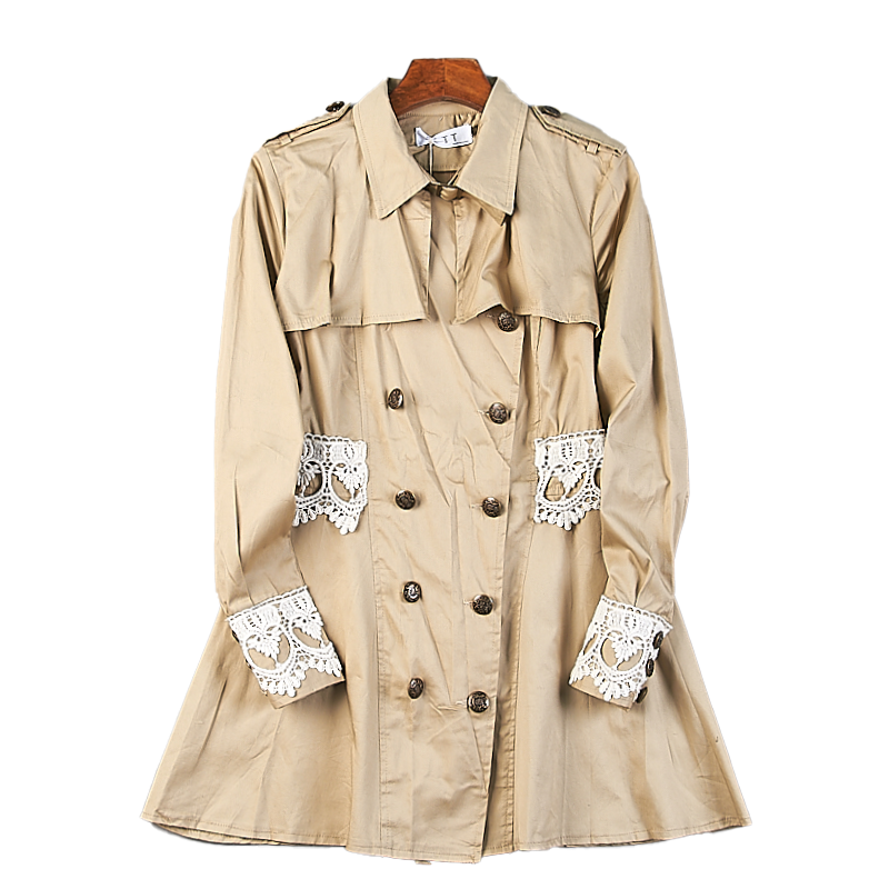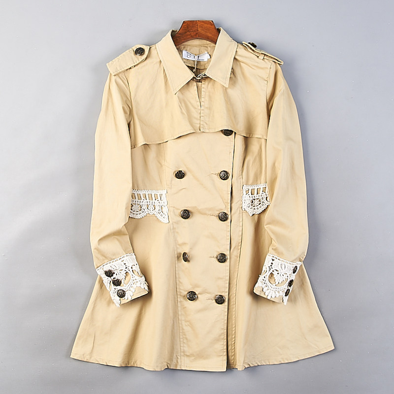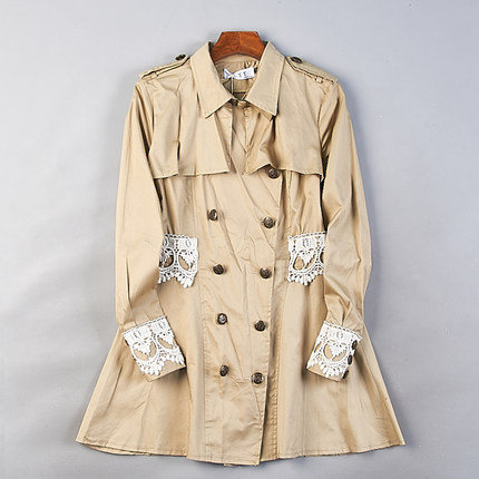 韩版复古肩章长袖风衣女11.5H80802春秋蕾丝装饰双排扣中长款外套