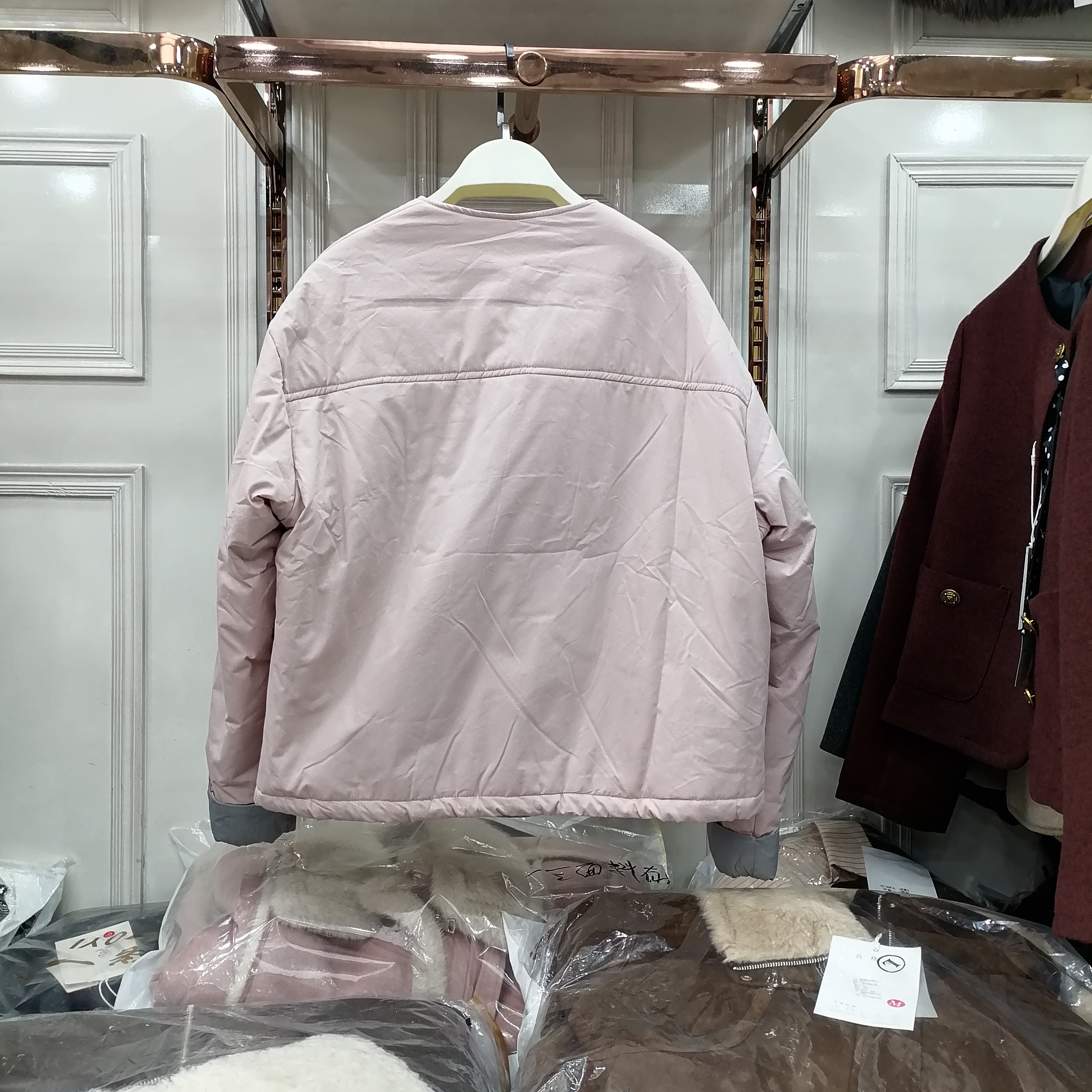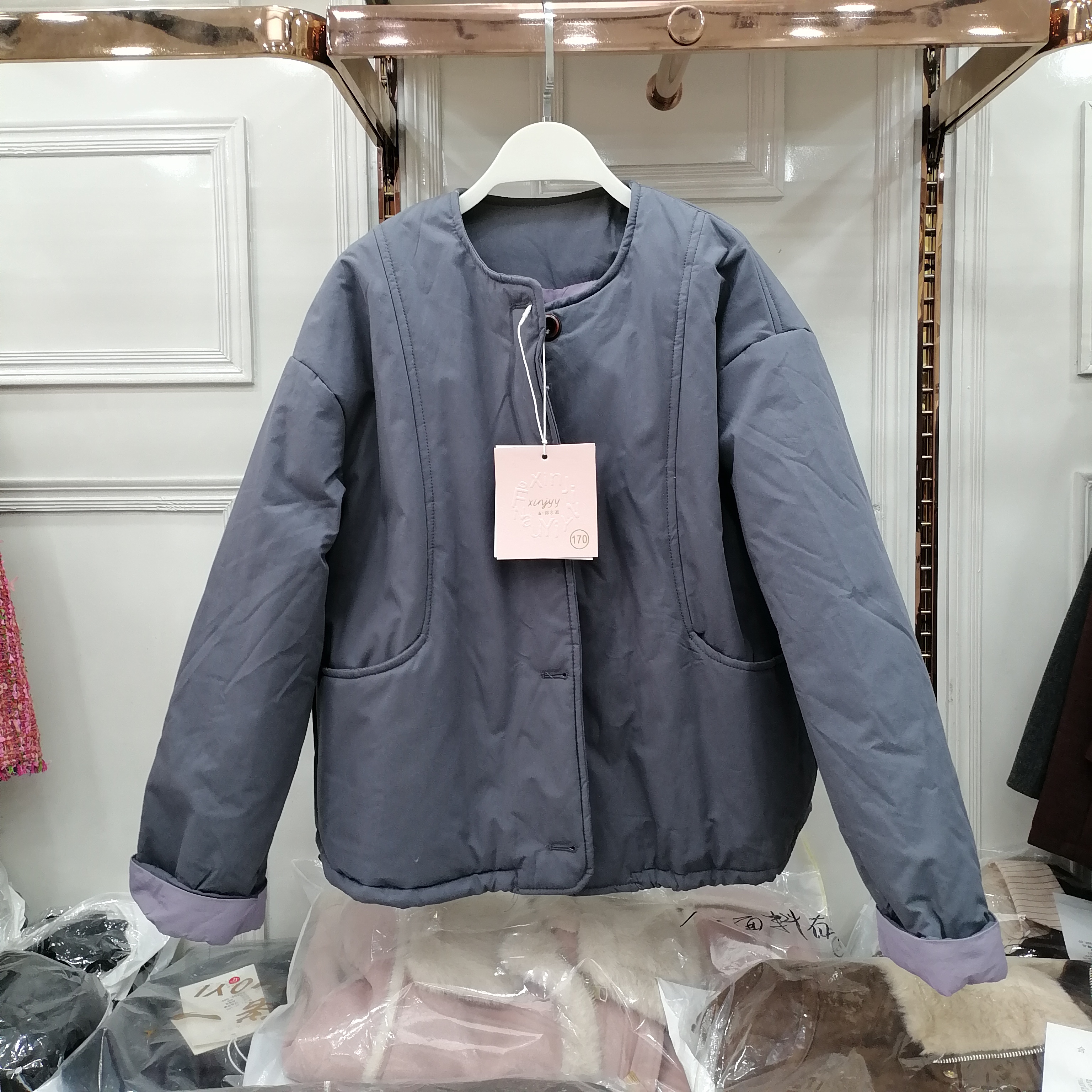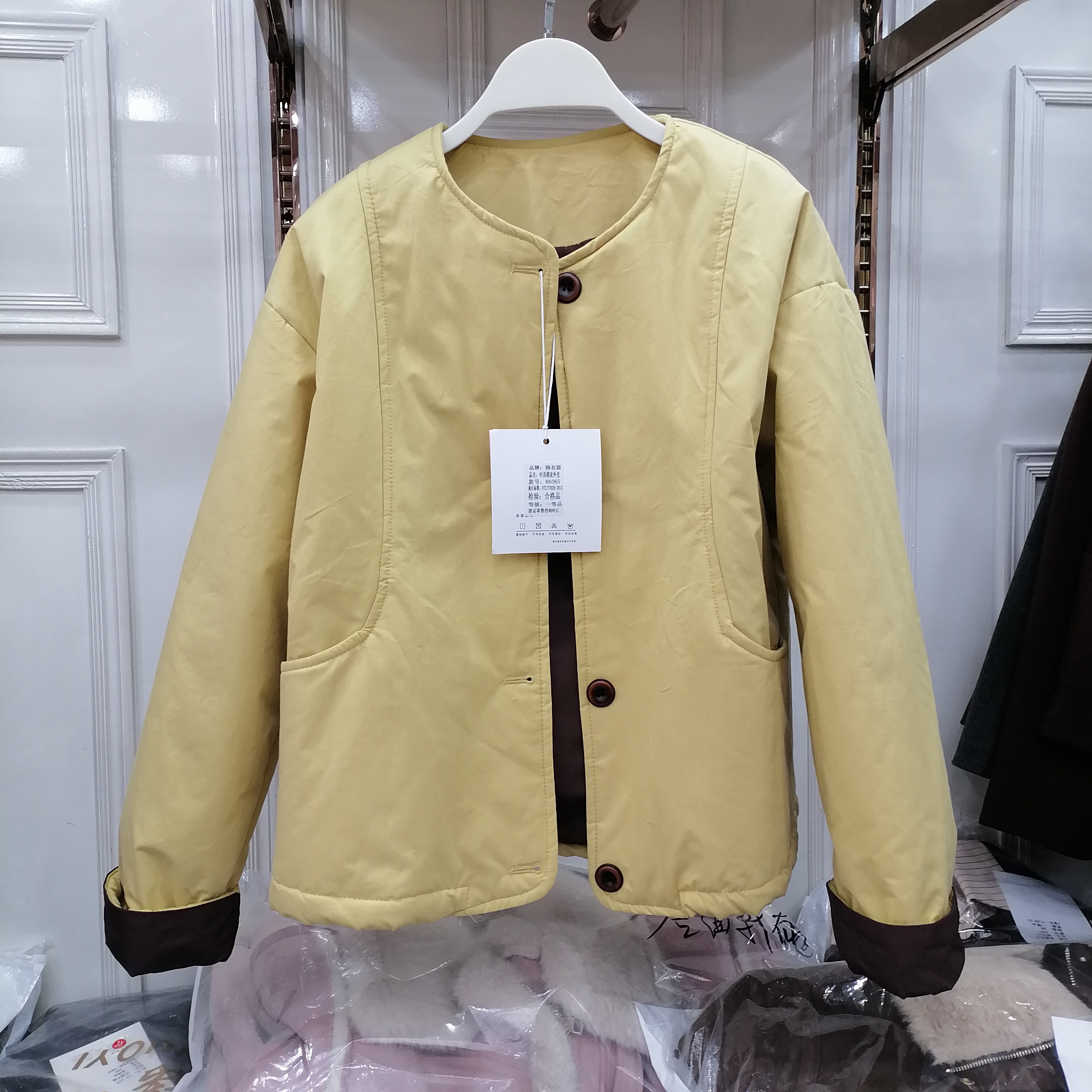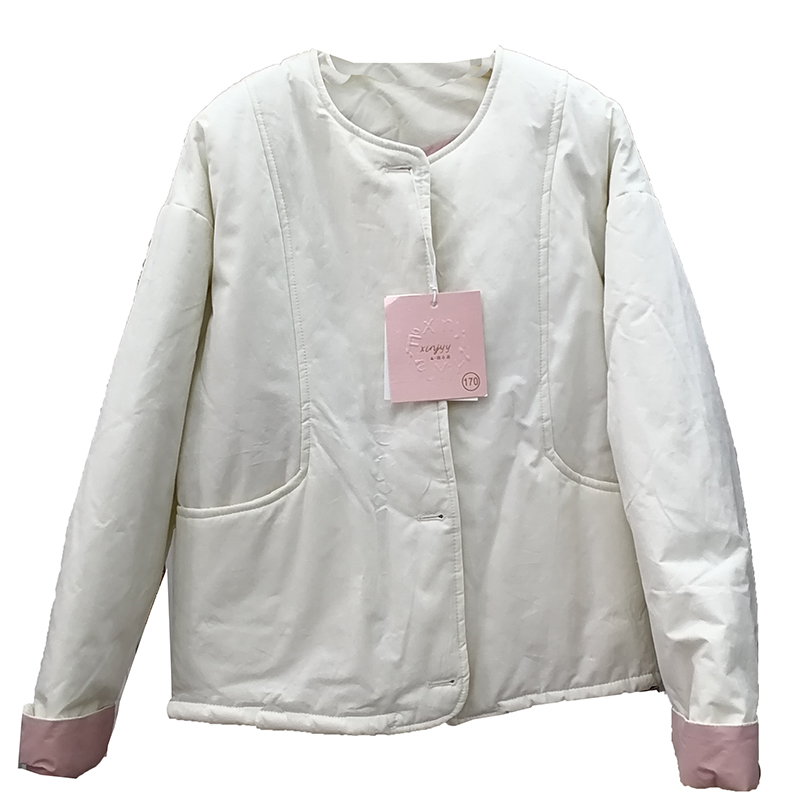单排扣轻薄棉衣圆领夹棉糖果色短款外套女纯色棉服撞色卷边袖上衣