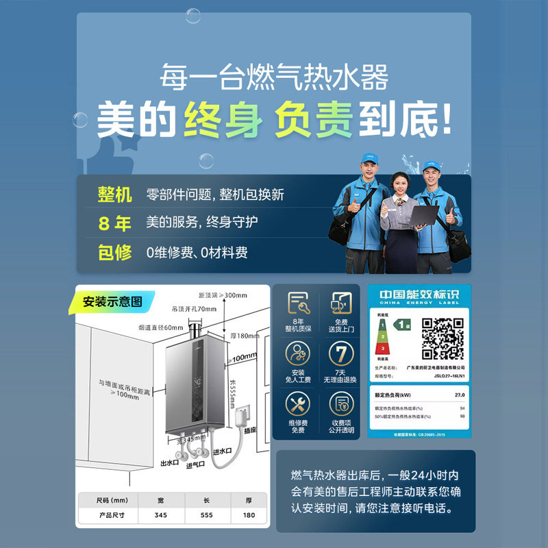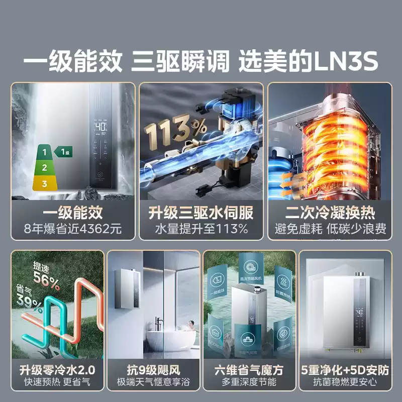 美的燃气热水器一级能效16升家用节能省气强排天然气零冷水LN3S