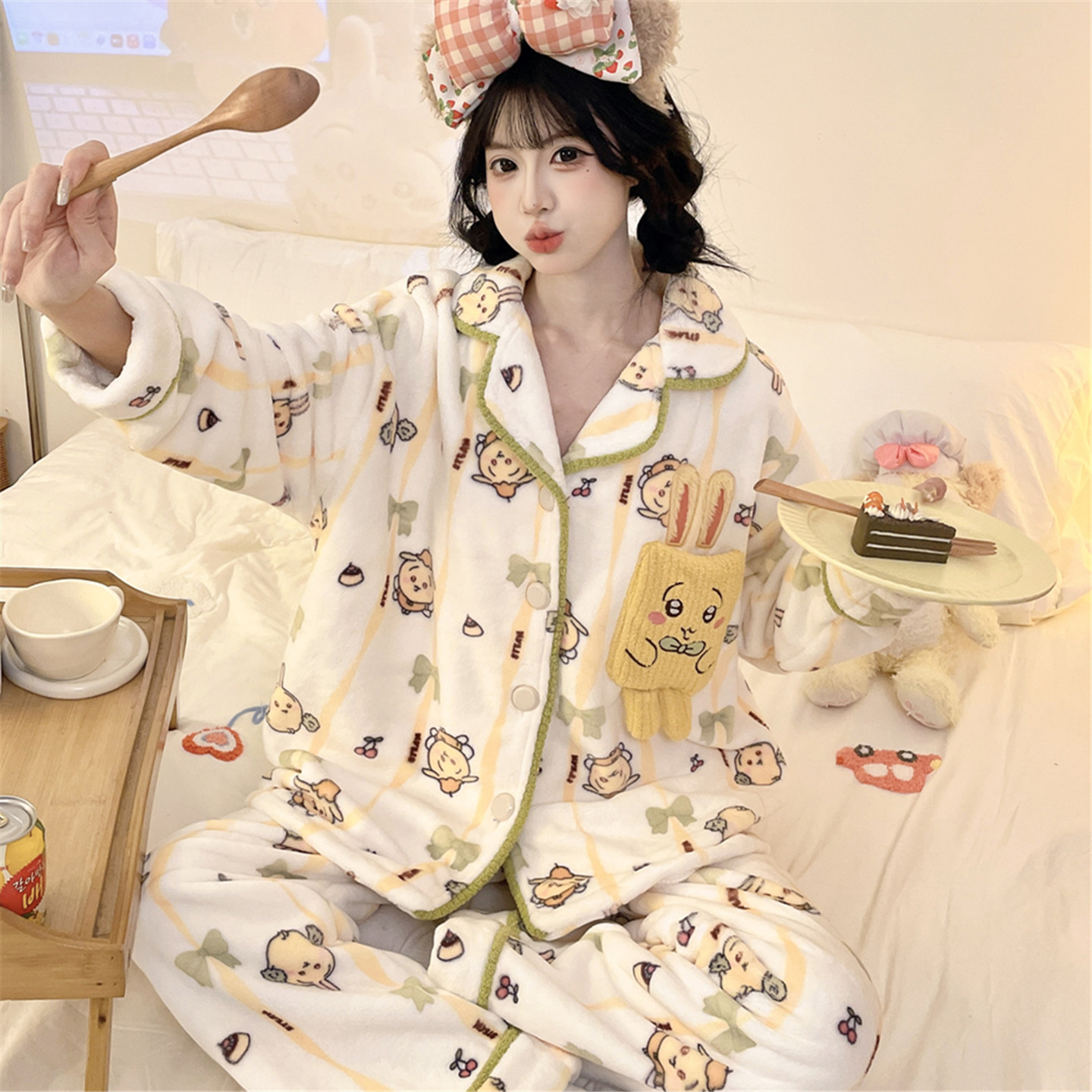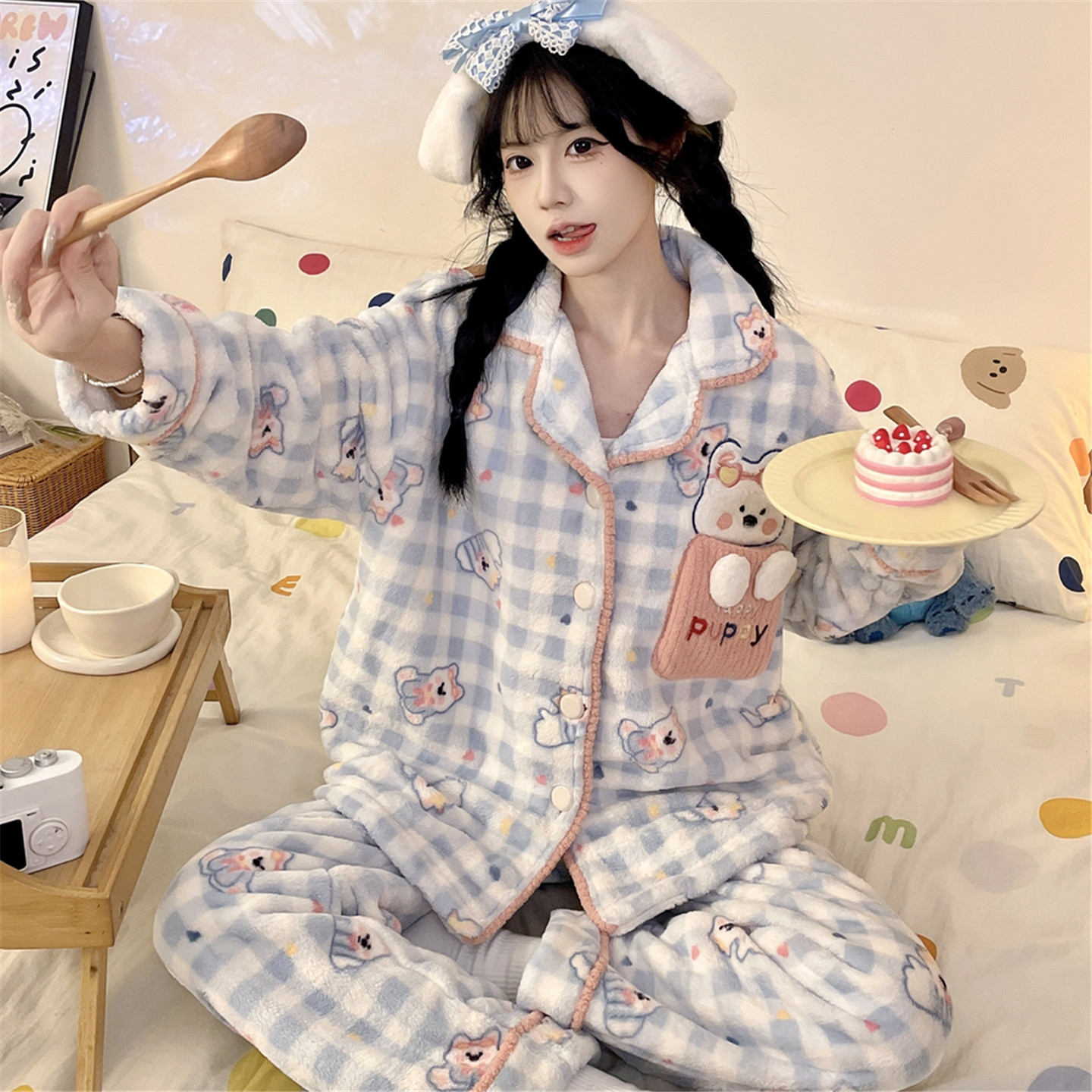 法兰绒睡衣女秋冬季加厚加绒大童女孩初中学生少女珊瑚绒开衫套装