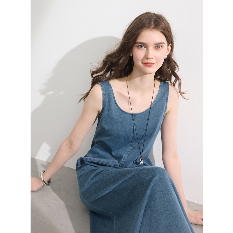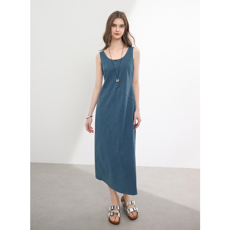 三彩2025夏季新款大U领牛仔连衣裙无袖A字长裙休闲开叉甜酷M
