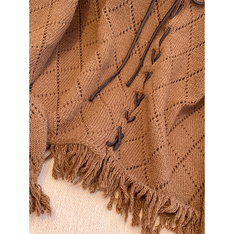 镂空菱格针织开衫女2025新款秋冬季小众设计感系带短款流苏毛衣