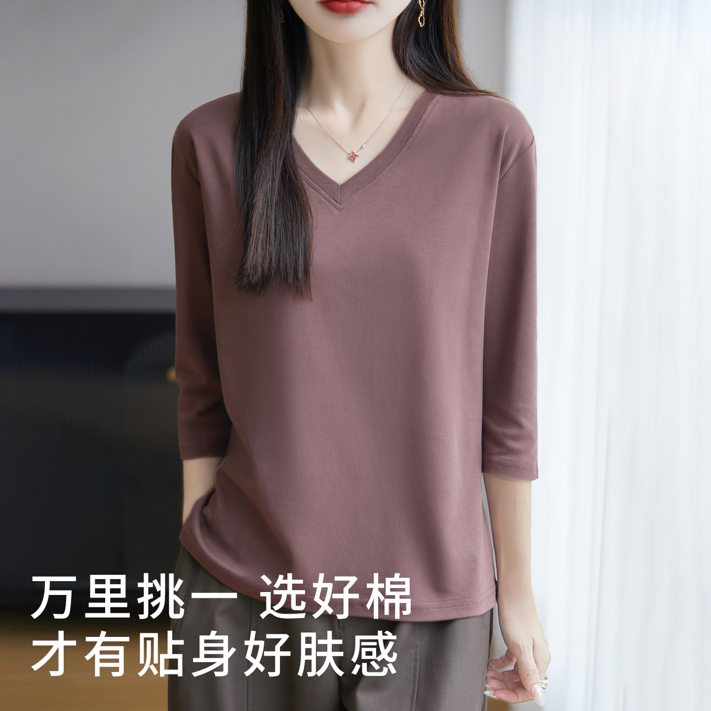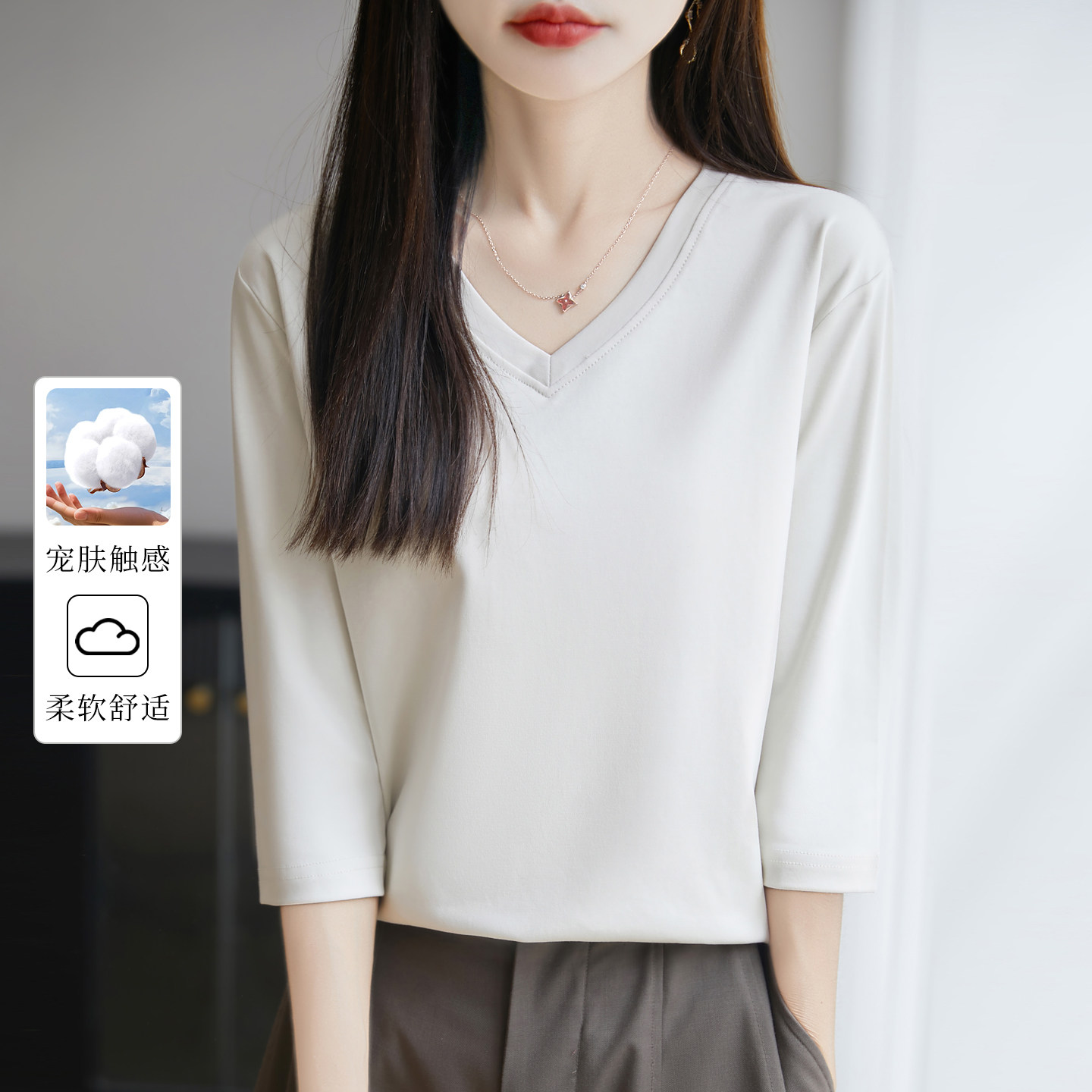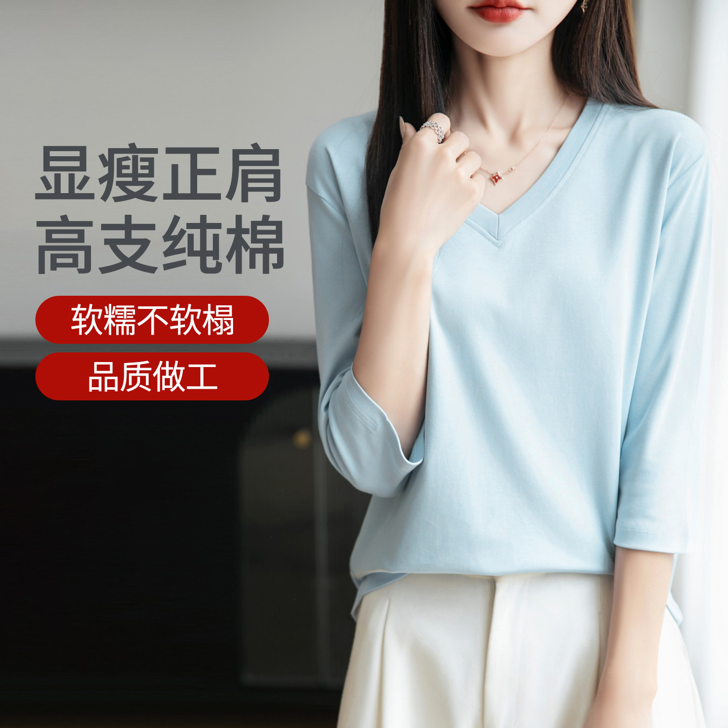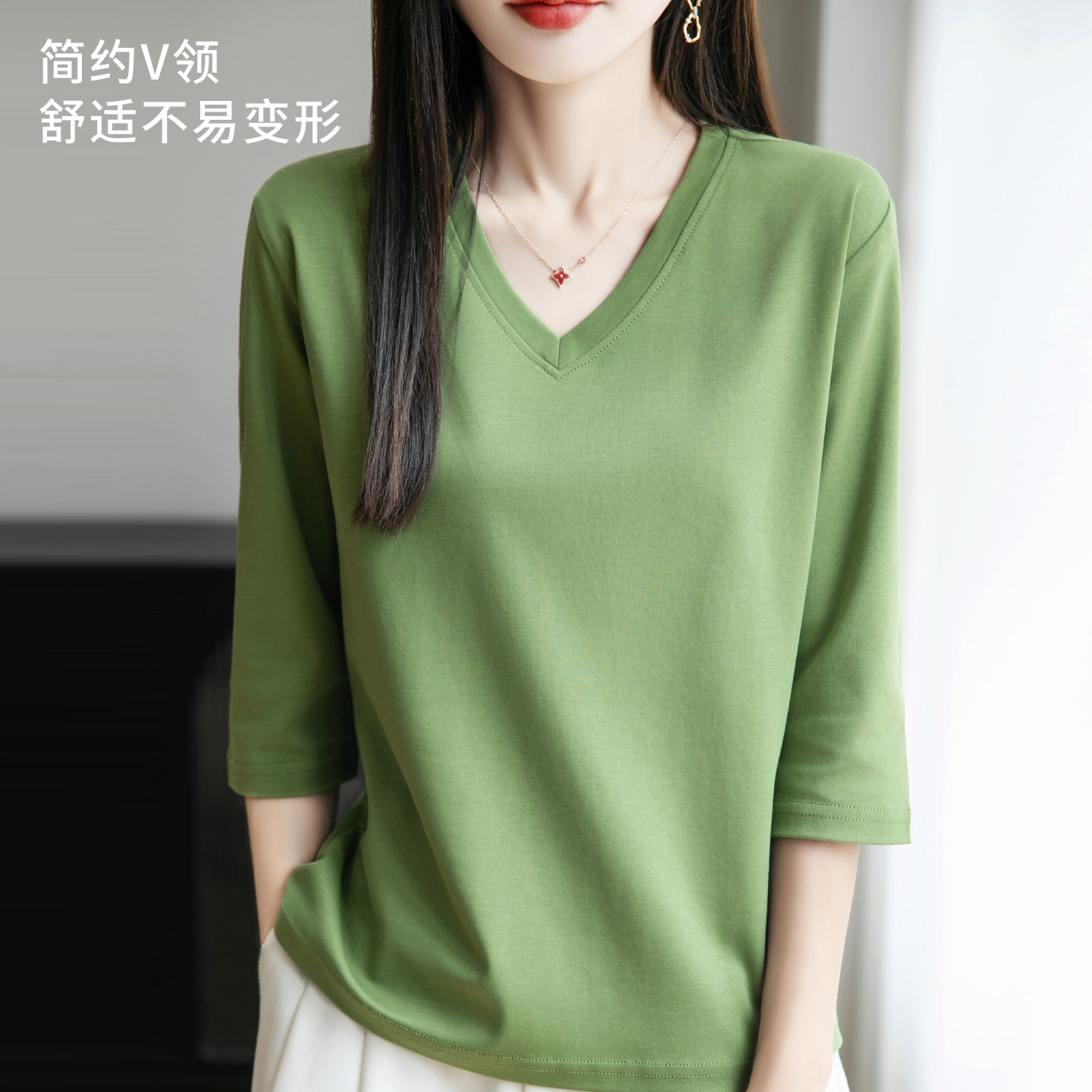 100%纯棉V领七分袖T恤女卫衣时尚减龄体恤宽松大码中袖全棉上衣薄