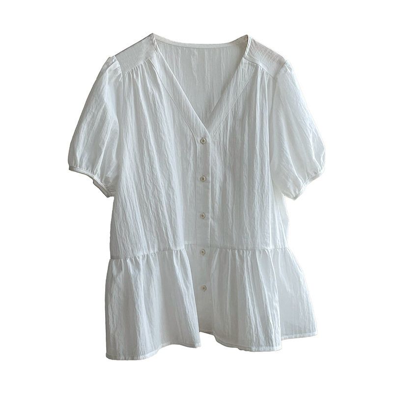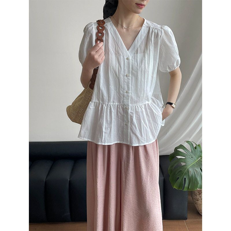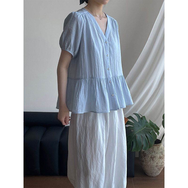 韩系V领单排扣娃娃衫女清新甜美收腰短袖衬衫2736 强明女装