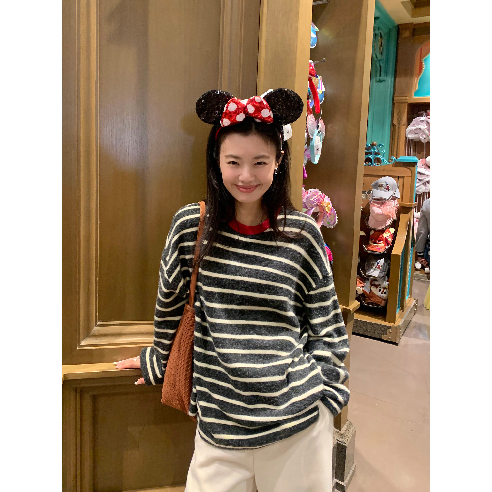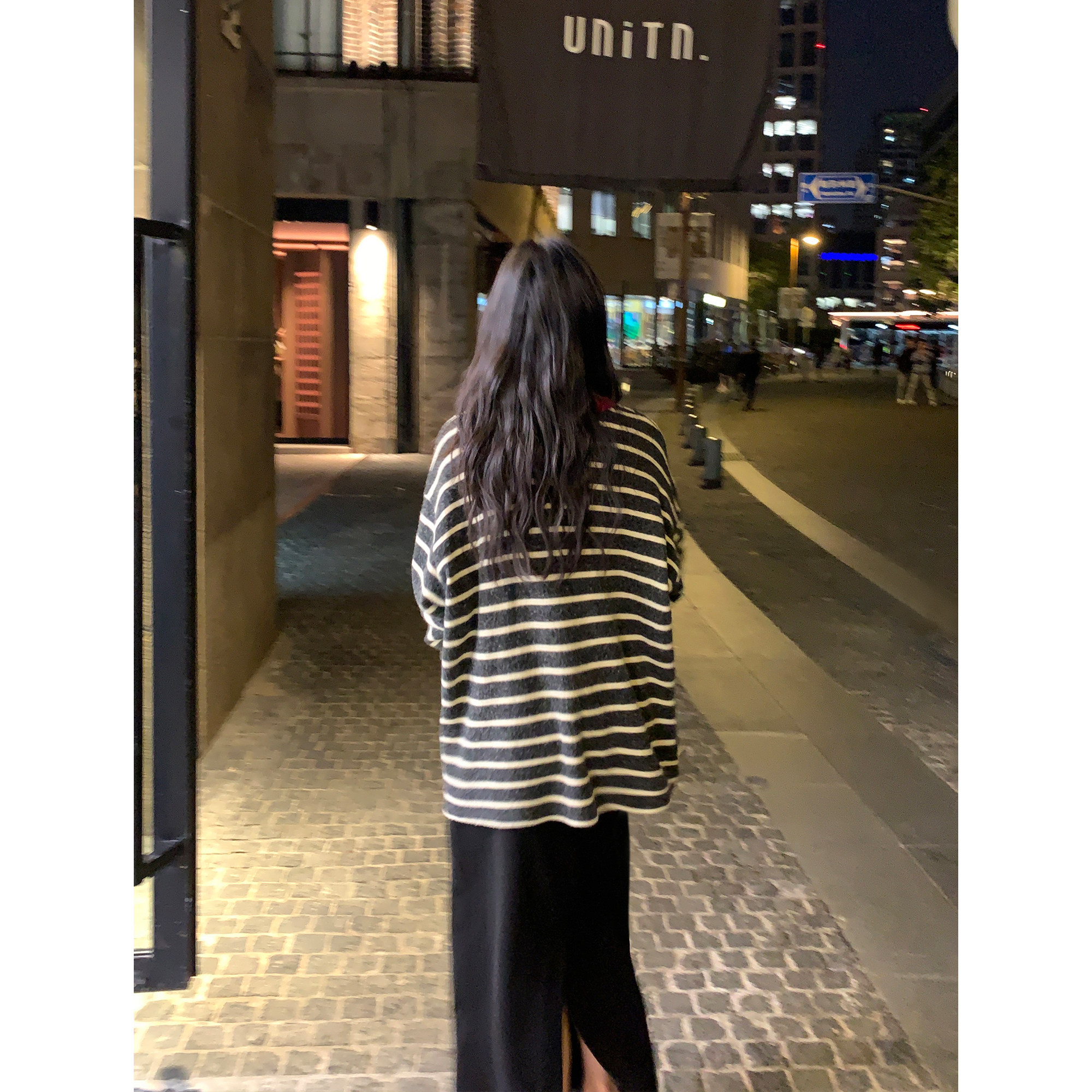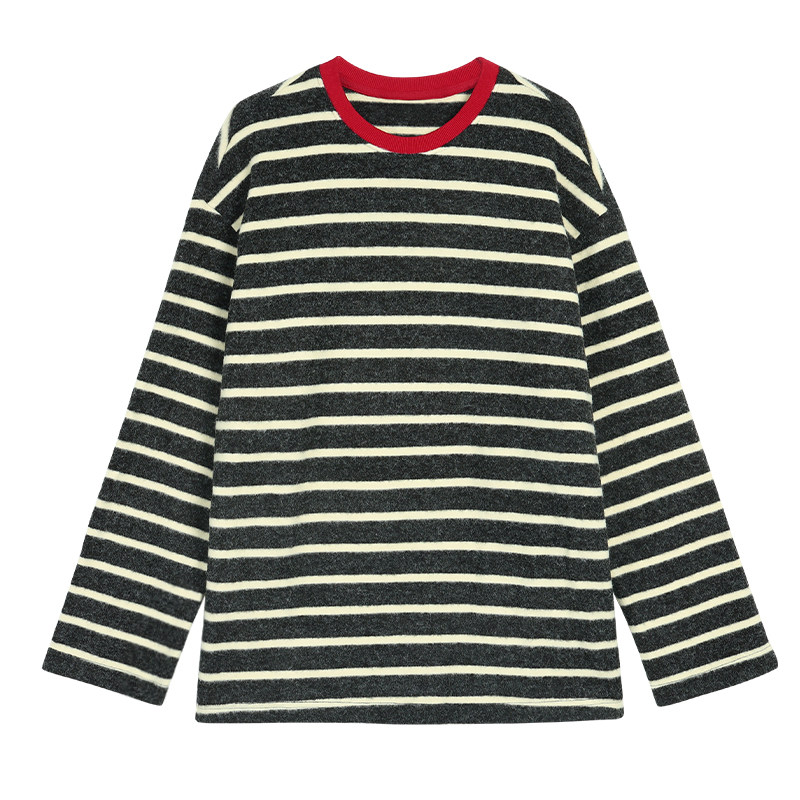 pusumede 撞色条纹磨毛针织t恤女宽松打底衫复古慵懒休闲长袖上衣