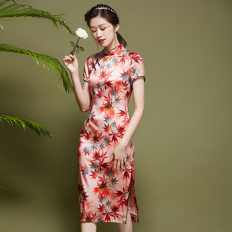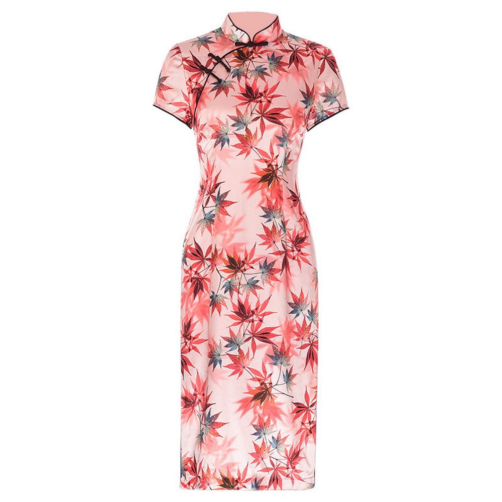 立领短袖盘扣枫叶印花旗袍连衣裙