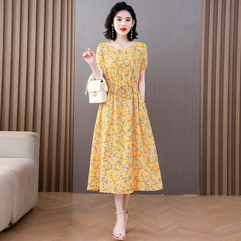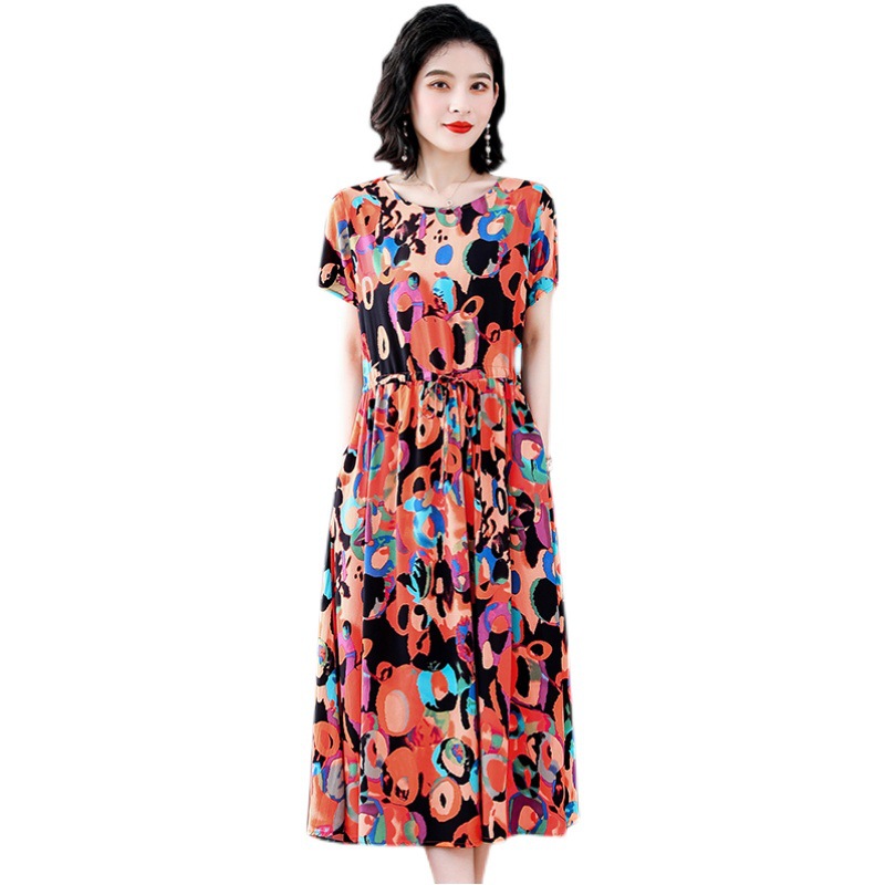 新款洋气棉绸连衣裙女夏季时尚收腰显瘦圆领中老年人造棉印花裙子