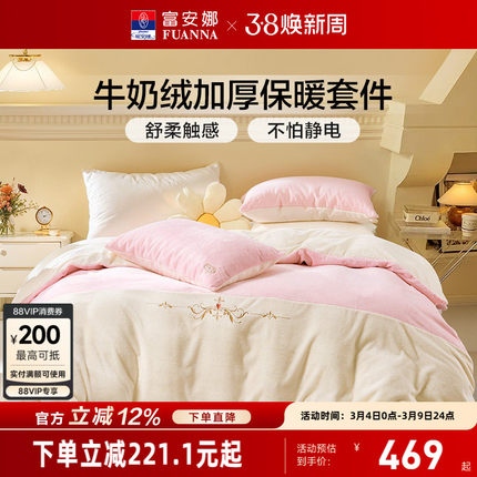 富安娜家纺慕斯绒四件套冬季加厚法兰绒床品牛奶绒珊瑚绒床单被套