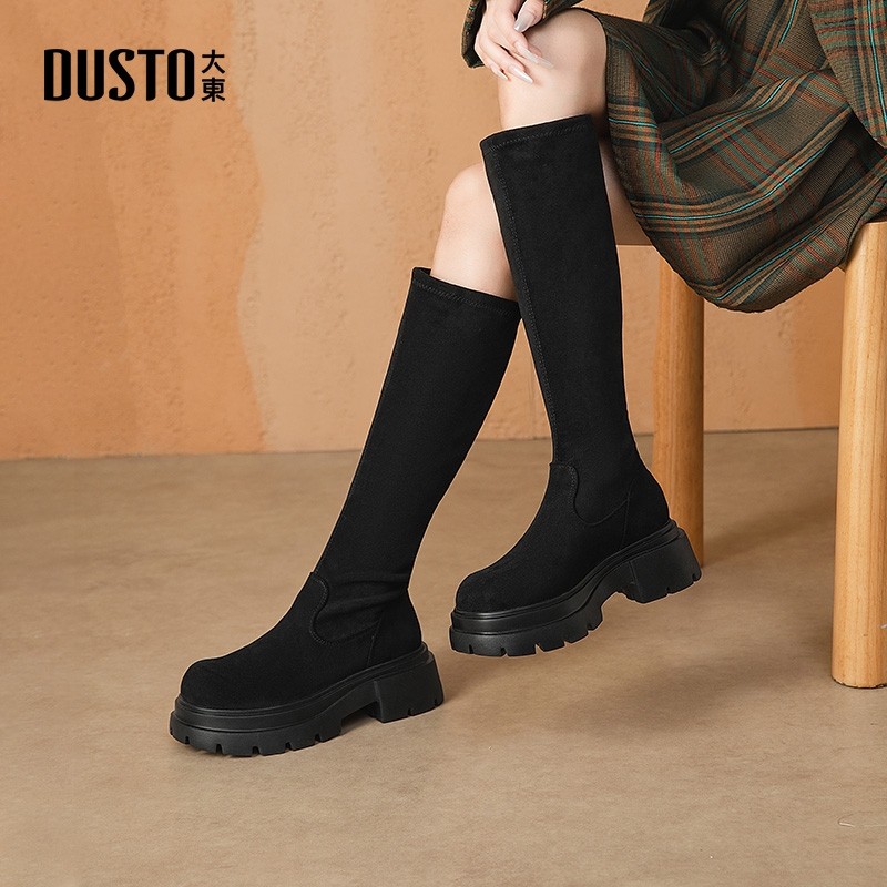 大东绒面长筒靴女秋冬2025新款靴子厚底弹力瘦瘦靴黑色显瘦高筒靴