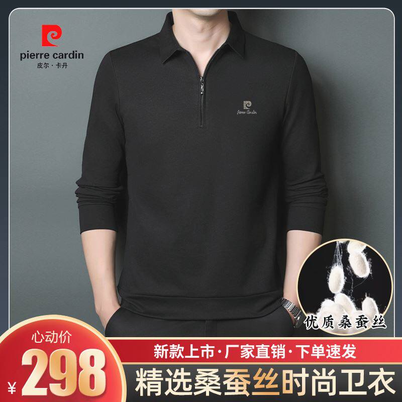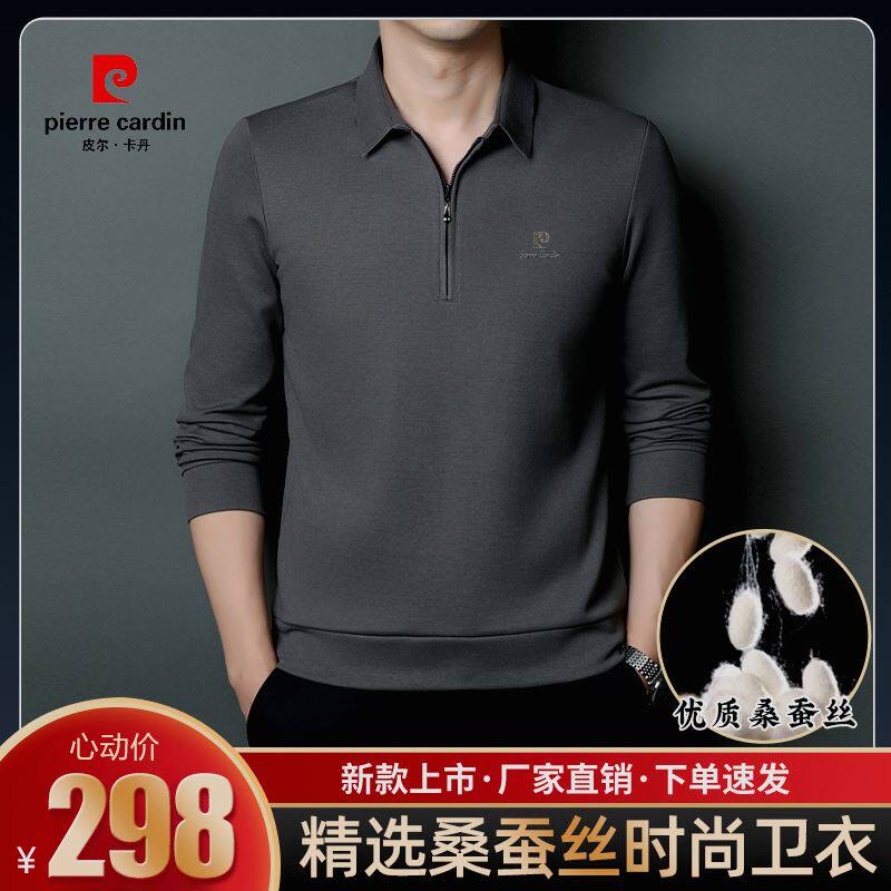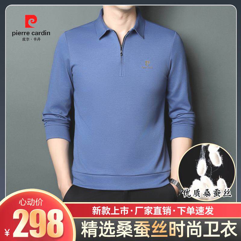 正品皮尔卡丹春季高档男士桑蚕丝长袖T恤休闲立领拉链卫衣POLO衫