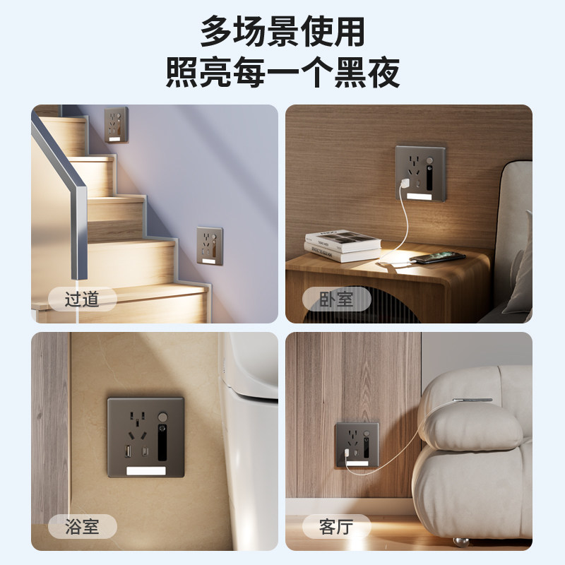 人体感应地脚灯带五孔插座带USB快充Type-c嵌入式小夜灯床头面板