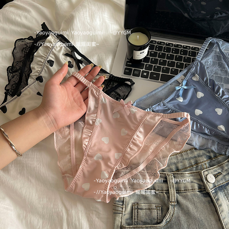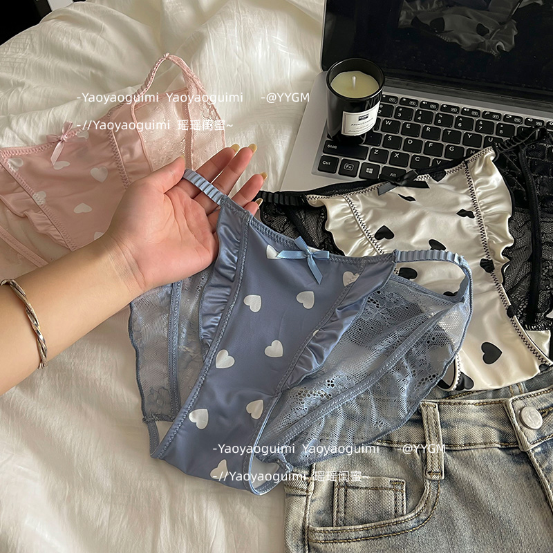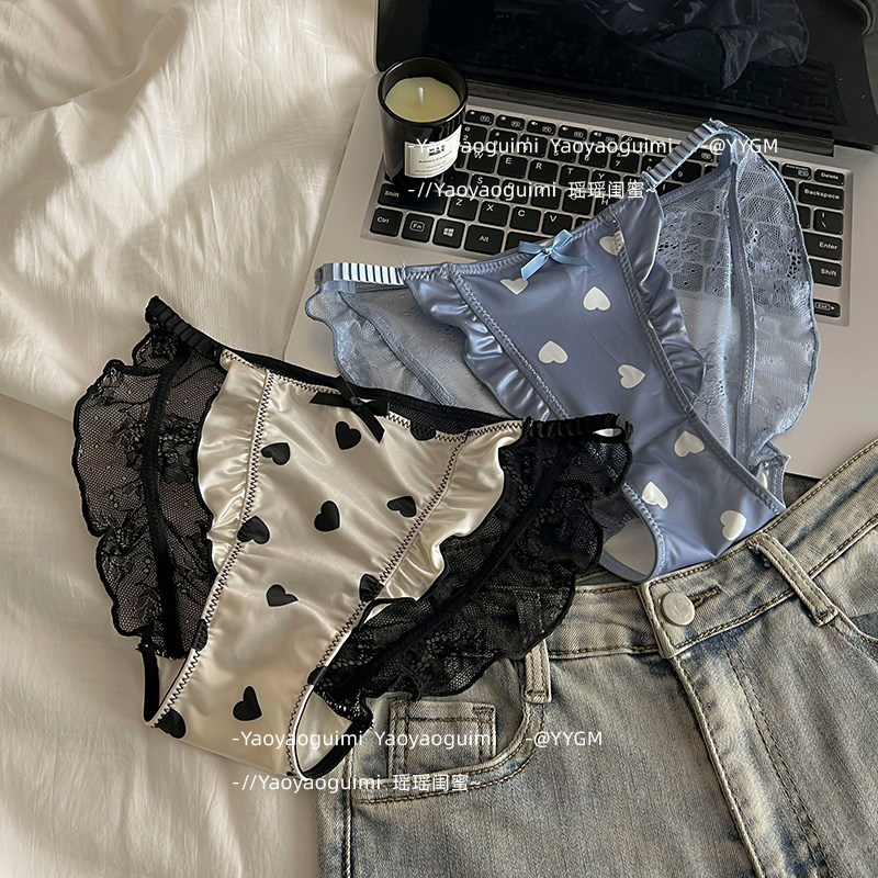 瑶瑶闺蜜原创设计性感蕾丝木耳边高级缎面爱心内裤女高开叉三角裤