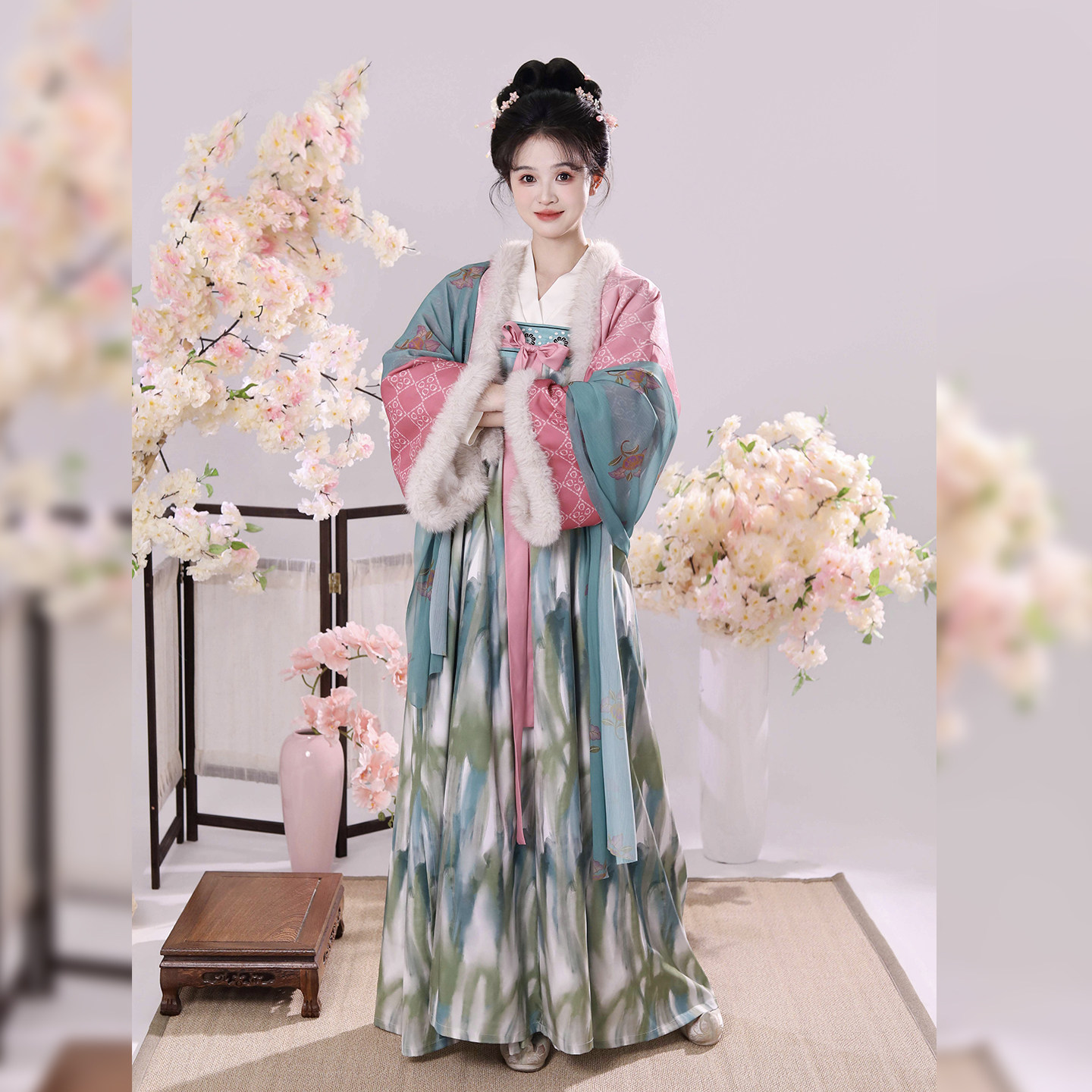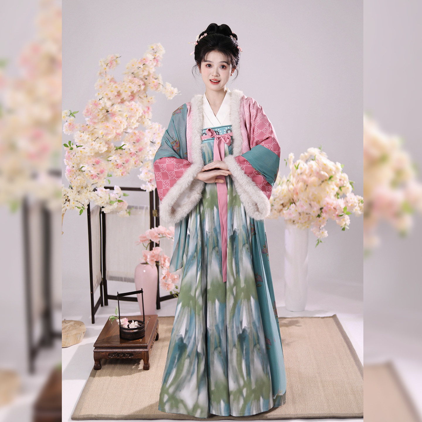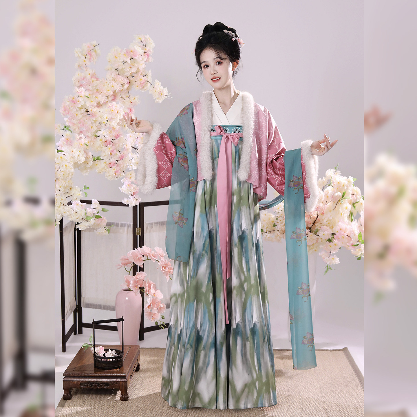织满庭原创法门寺芰荷改良加绒刺绣齐胸连衣裙秋冬女新款日常套装