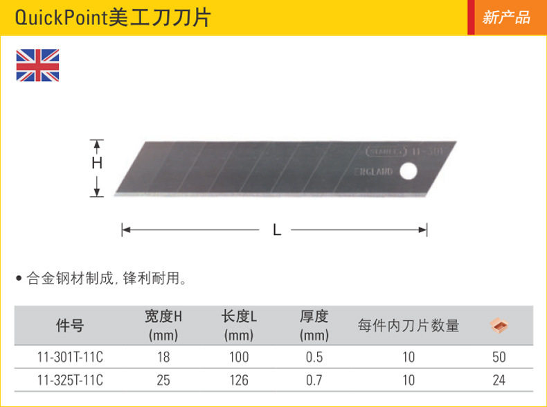 STANLEY史丹利QuickPoint美工刀刀片11-301T-11C 18mm刀片一盒