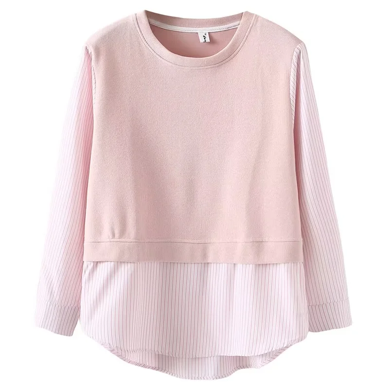 胡子叔家大码假两件女上衣拼接衬衫圆领遮屁股针织衫胖mm早秋卫衣