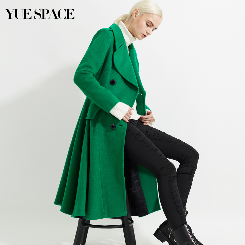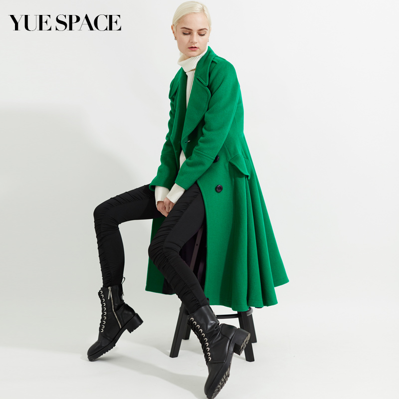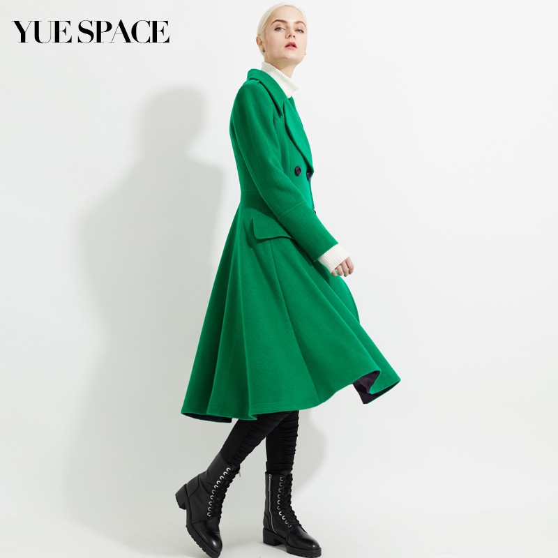 悦空间超长羊毛呢大衣外套女西装领大裙摆双排扣修身显瘦欧美秋冬
