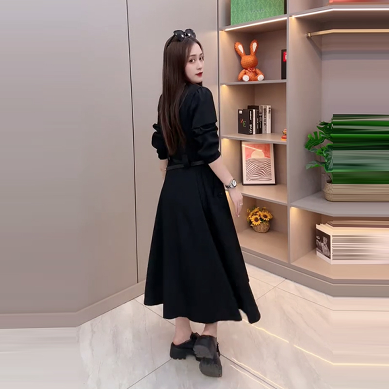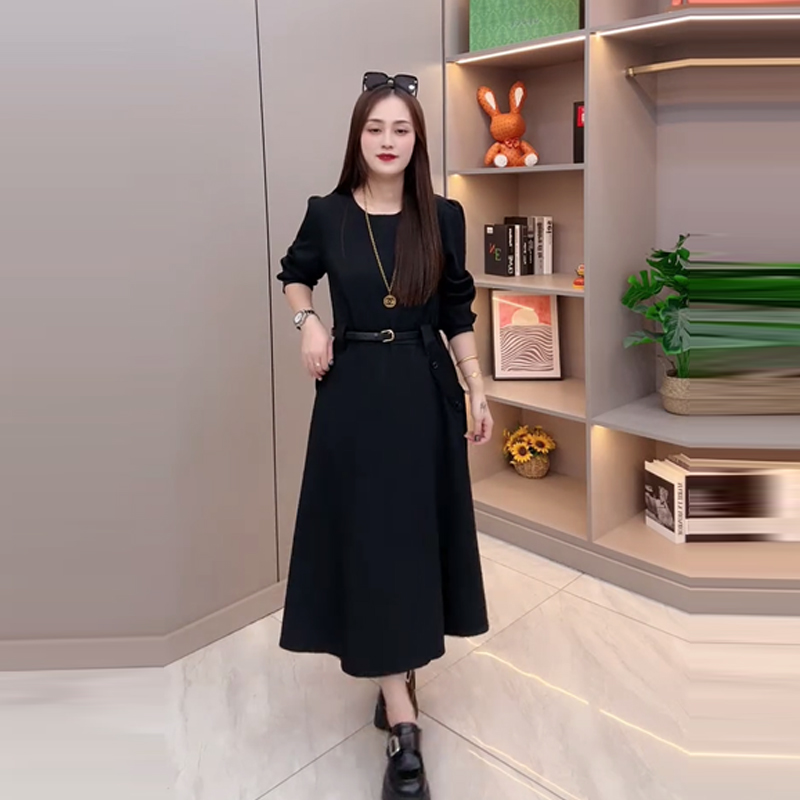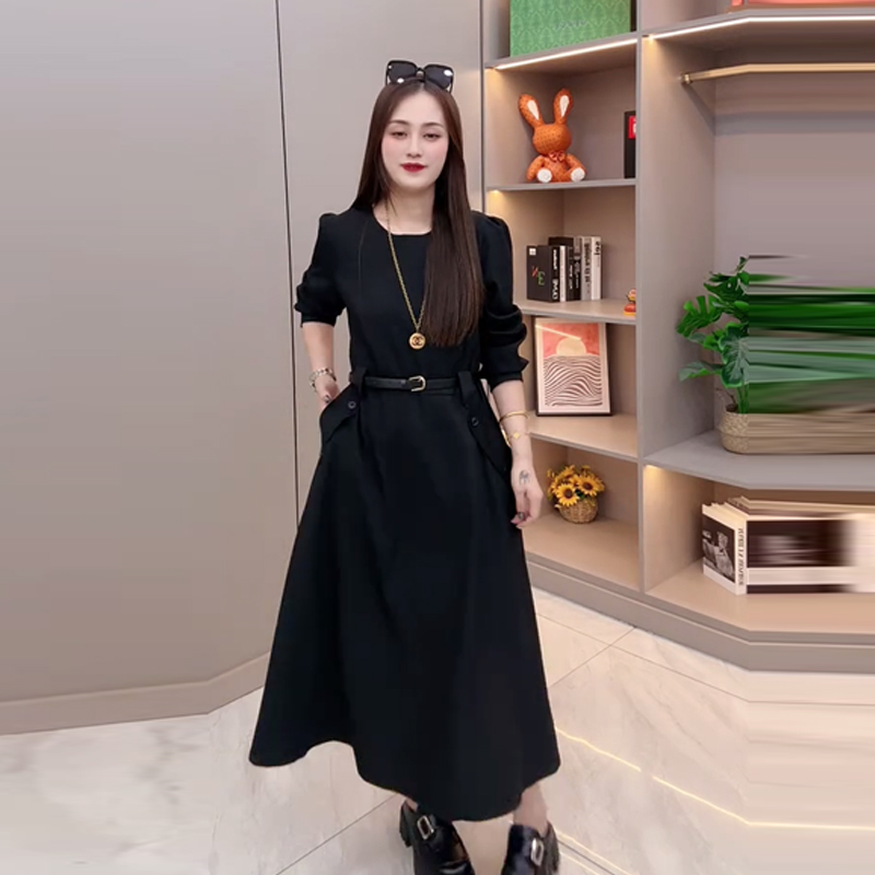 胖MM加肥圆领腰带长袖连衣裙大码女装气质通勤风长款显瘦黑色裙子