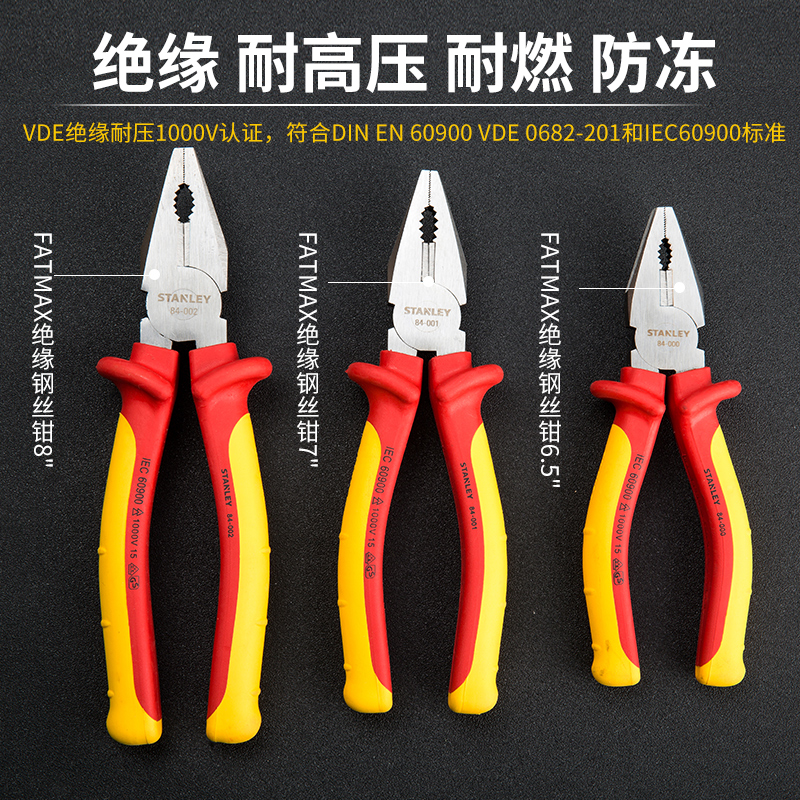 史丹利绝缘钢丝钳6.5寸84-000-23/7寸84-001/8寸84-002加硬老虎钳