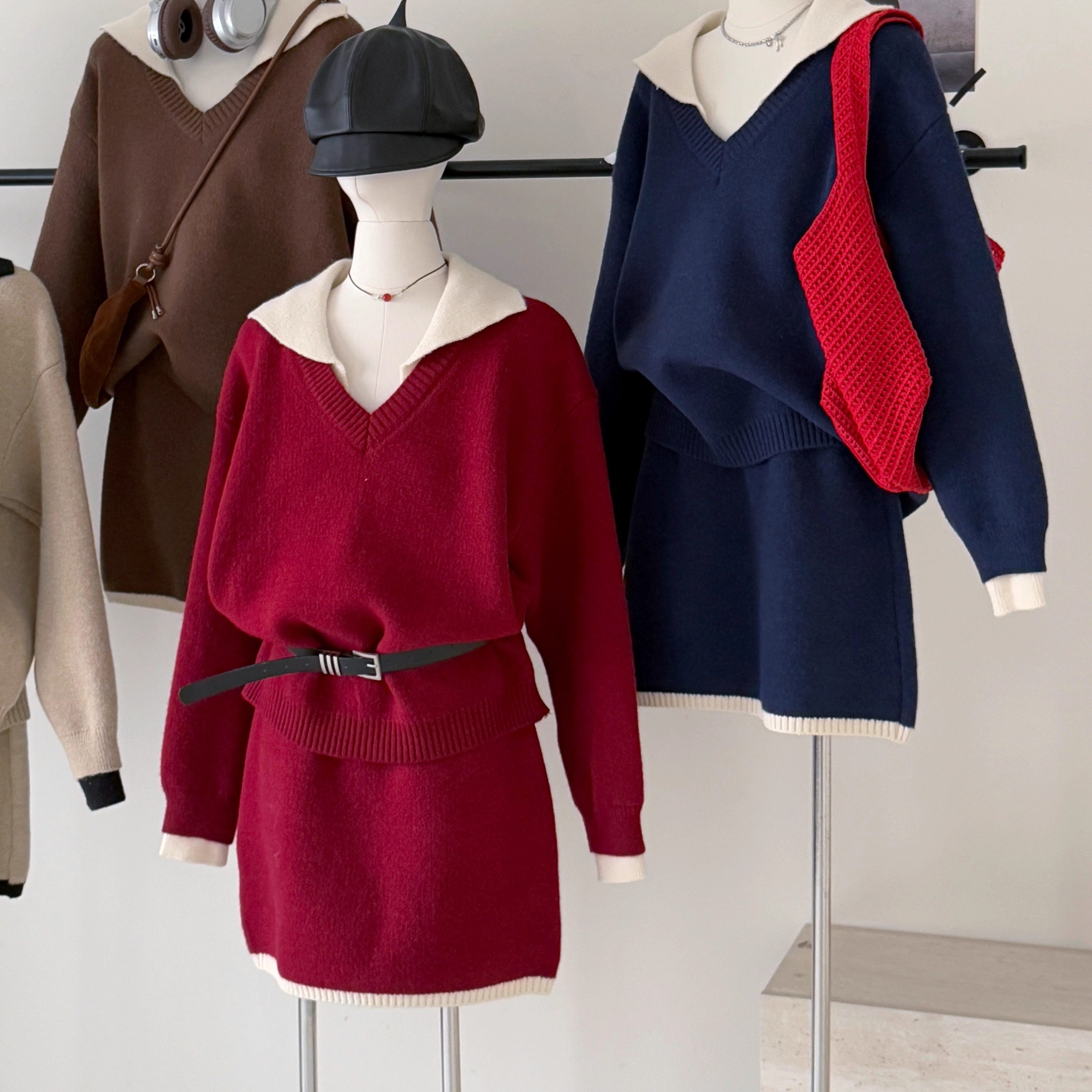 英式撞色红色套头毛衣女+针织半身裙两件套装韩系一整套深冬穿搭