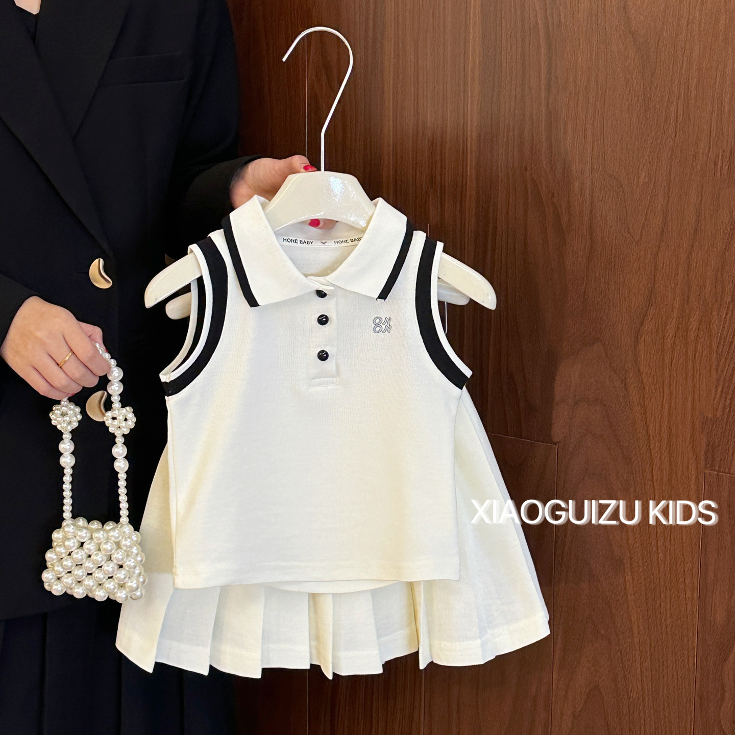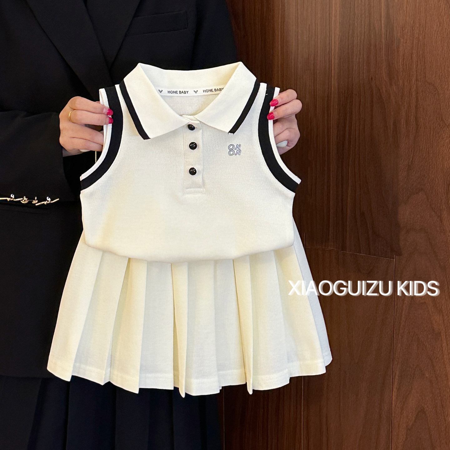 女童套装夏2025新款儿童白色运动套裙中大童polo领无袖背心百褶裙