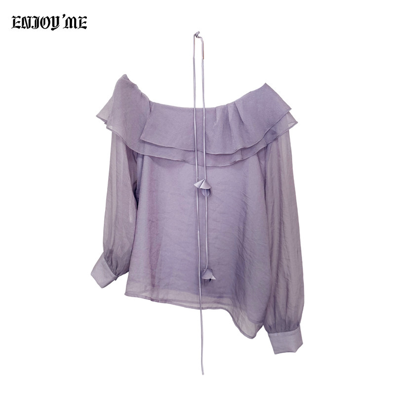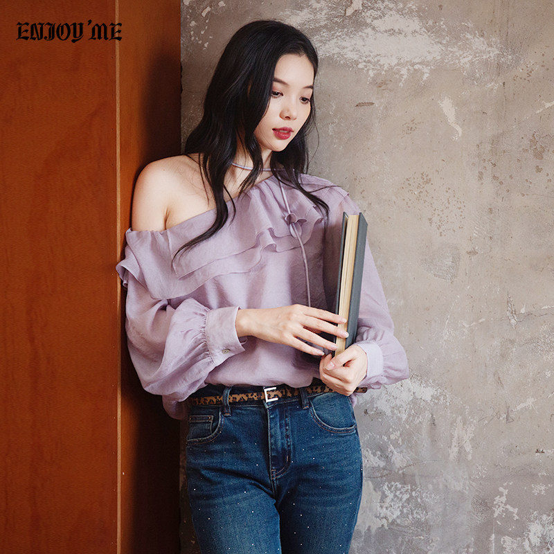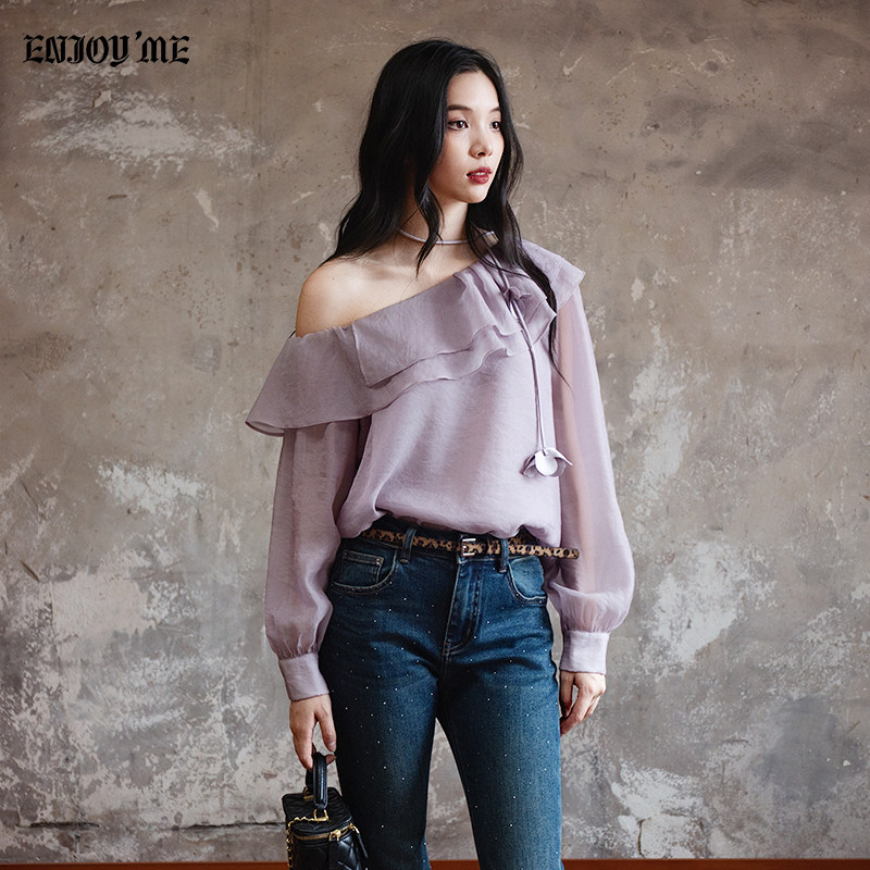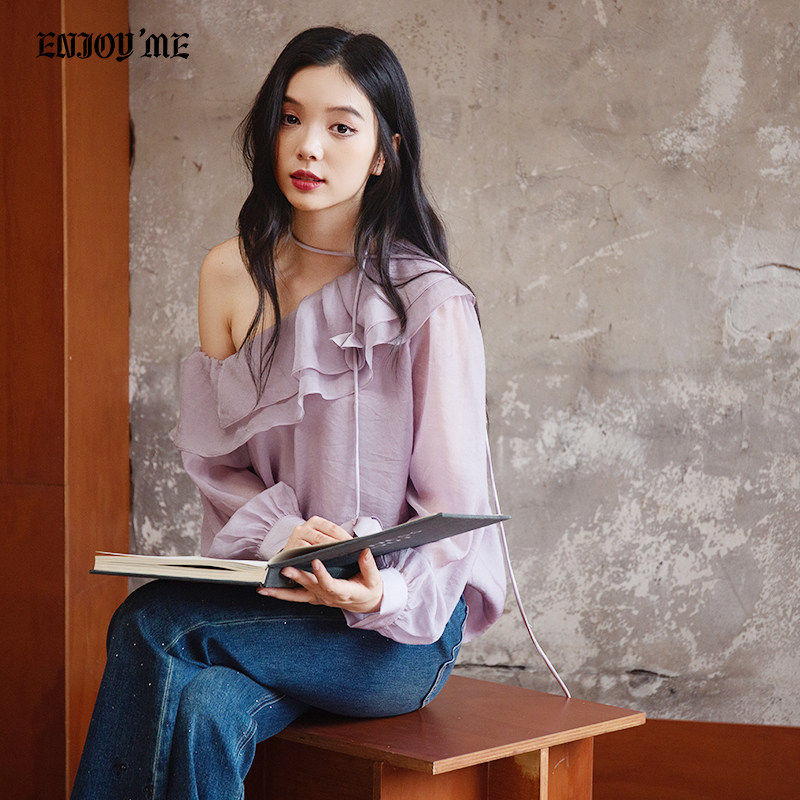 ENJOYME 商场同款法式荷叶边紫色斜肩长袖衬衫女早秋新款露肩衬衣