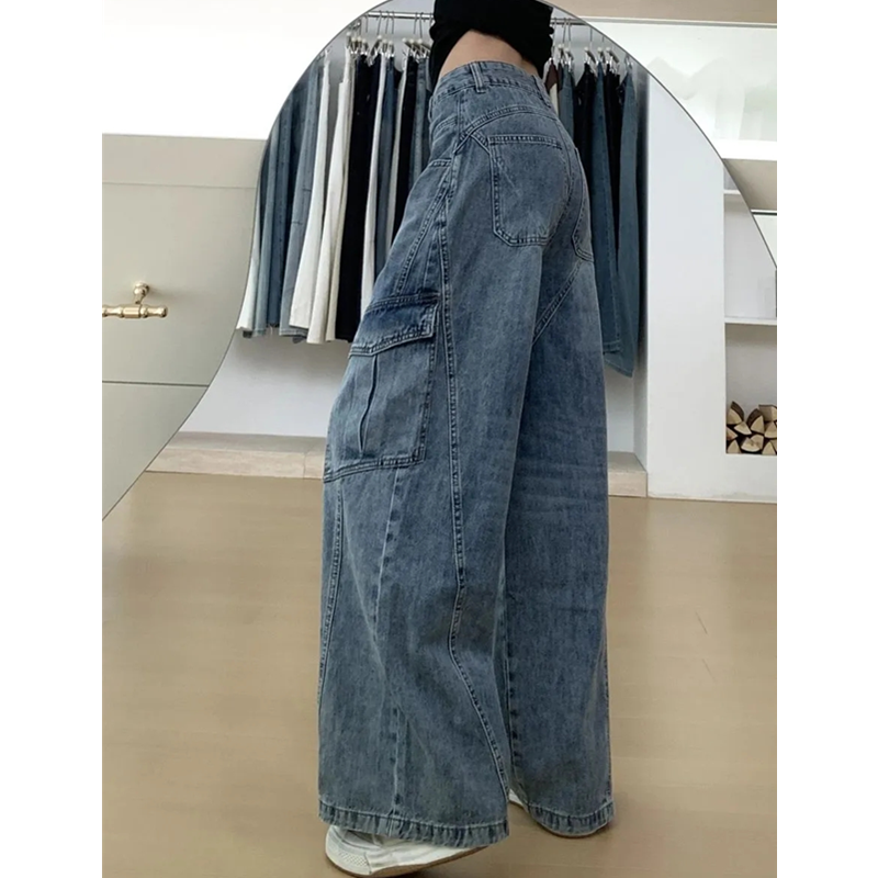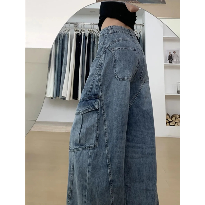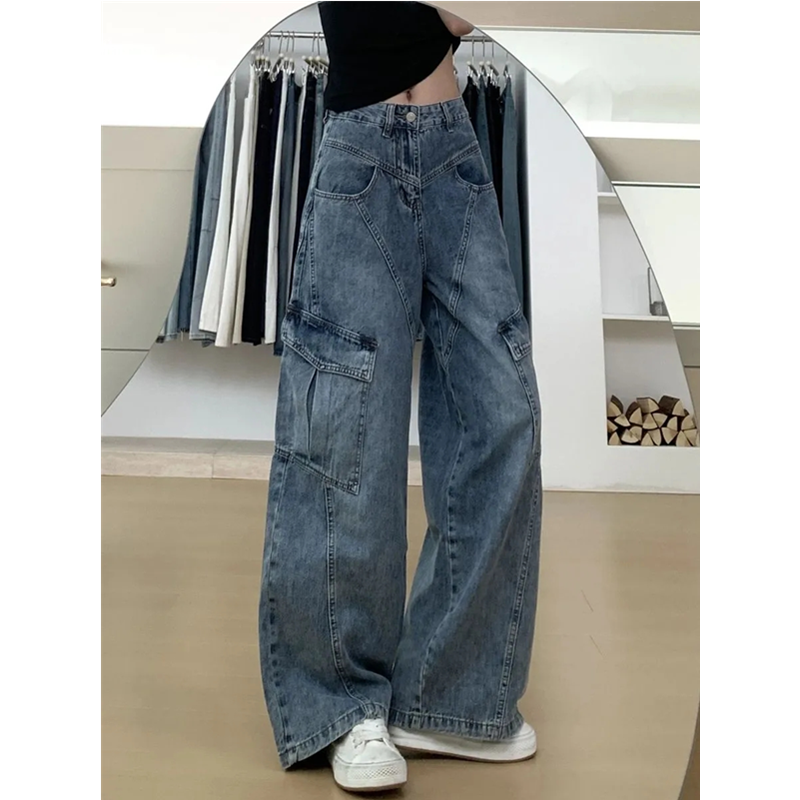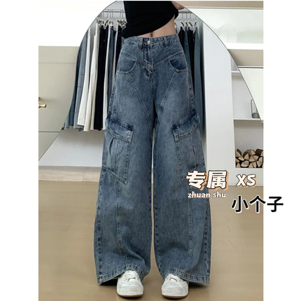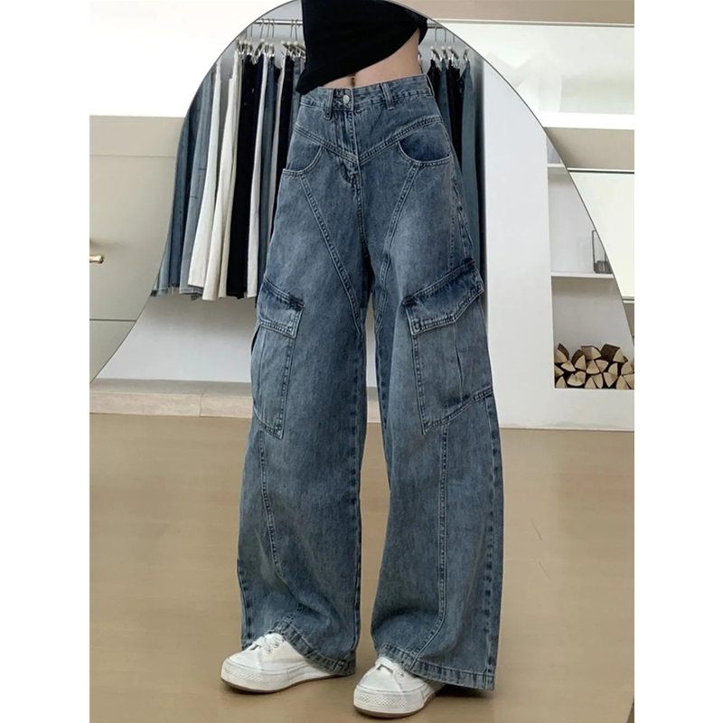 高街斜线分割设计阔腿牛仔工装裤女小个子高腰宽松显瘦直筒拖地裤