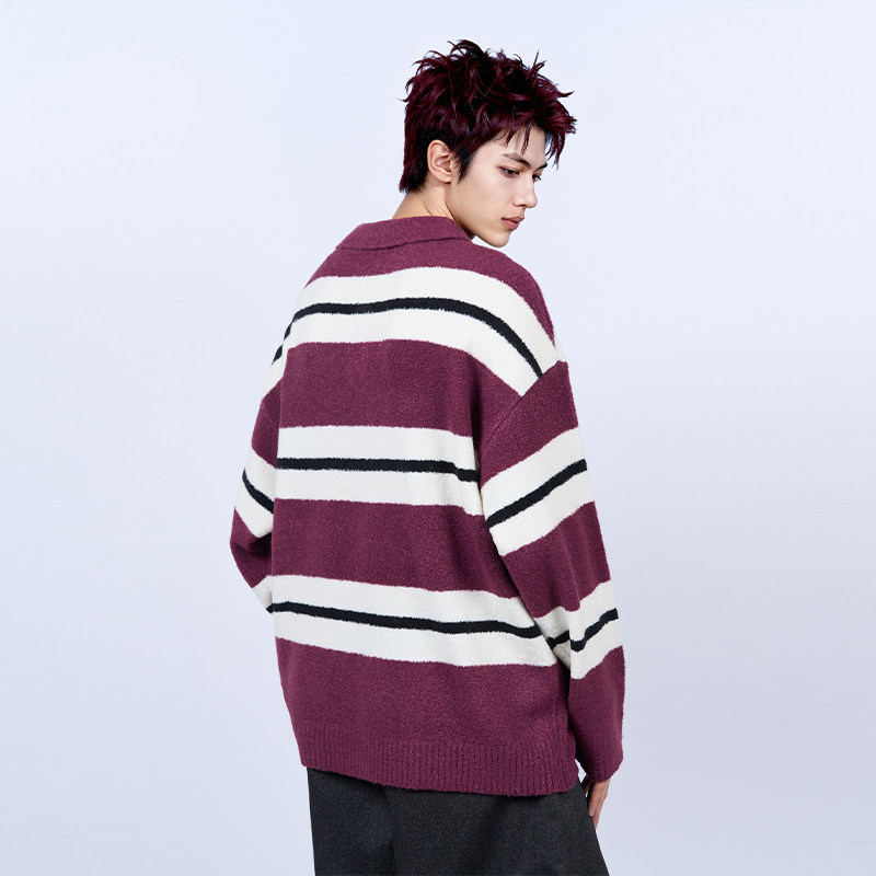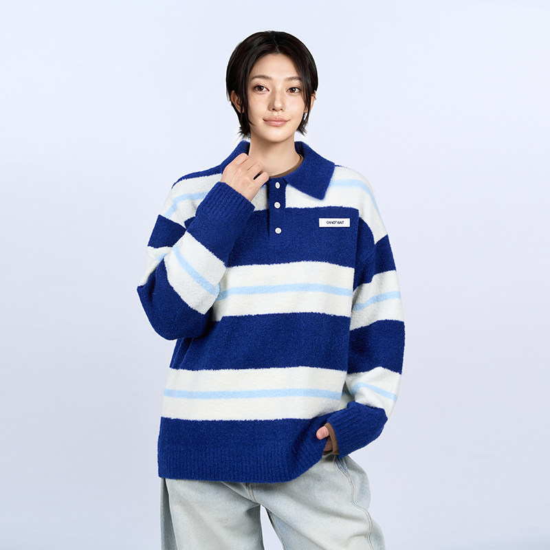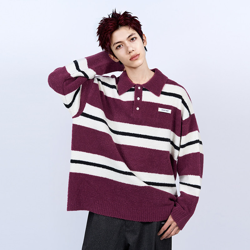 陈伟霆毛衣CANOTWAIT_彩色条纹POLO领落肩套头毛衣秋冬宽松温暖