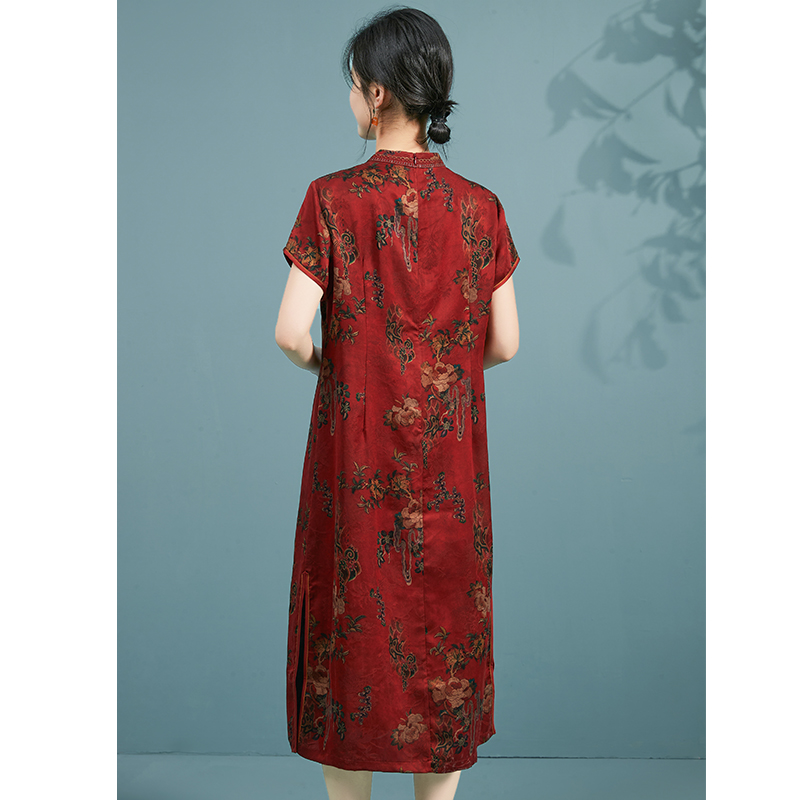 金菊100%真丝非遗香云纱春夏立领绣花短袖桑蚕丝女式连衣裙