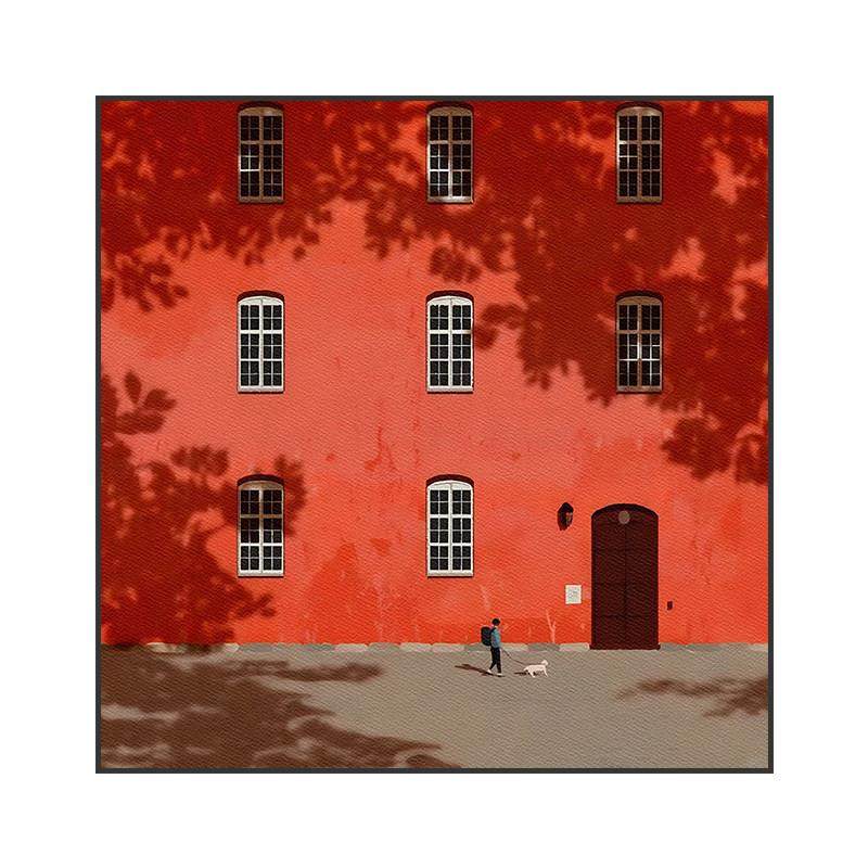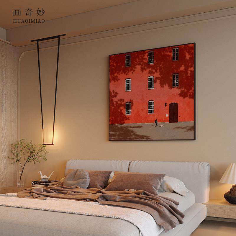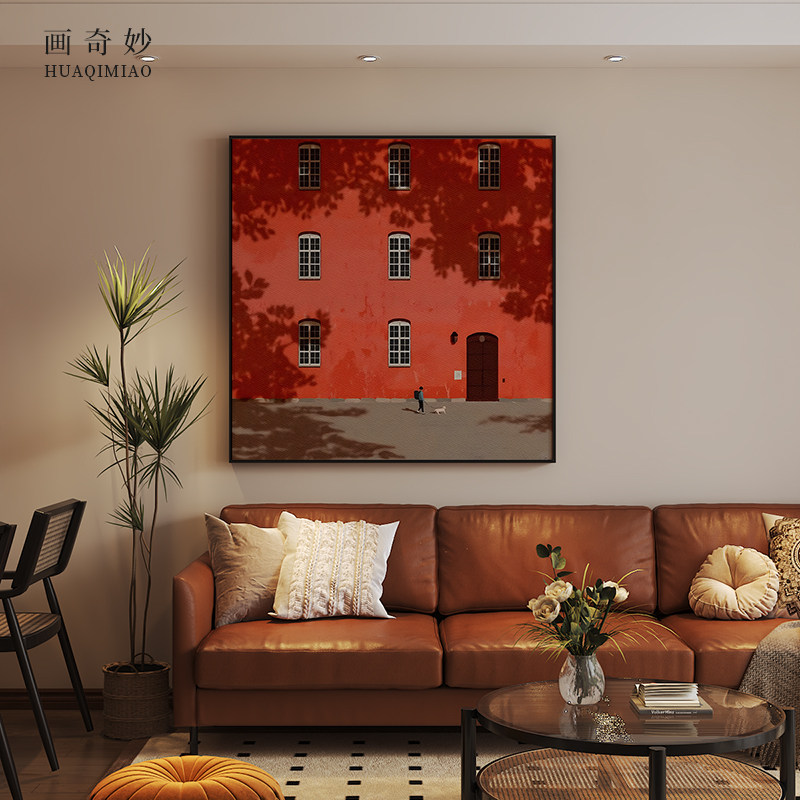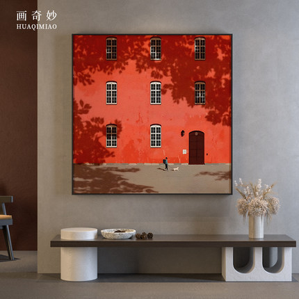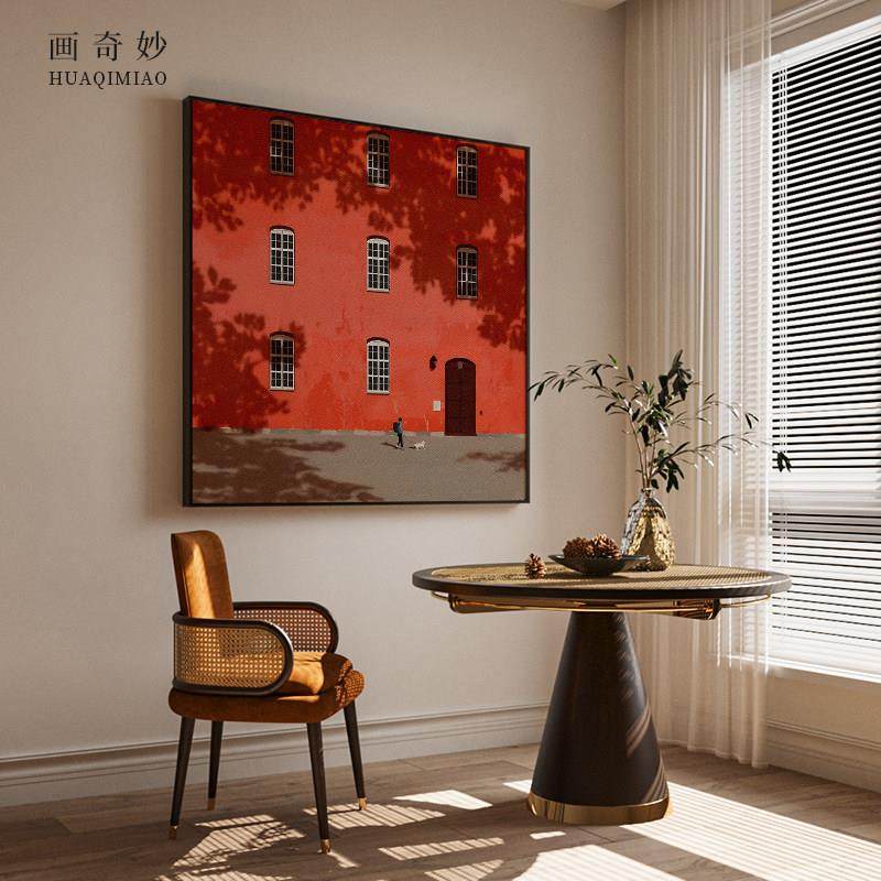 现代轻奢红色建筑复古风小众卧室客厅玄关装饰画背景墙壁方型挂画