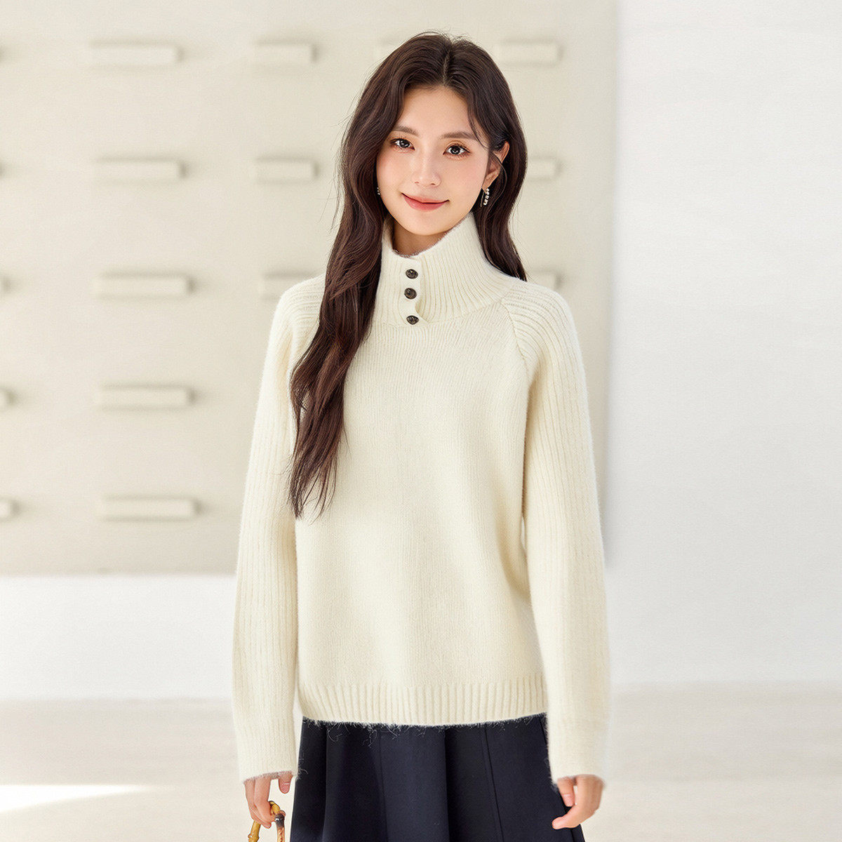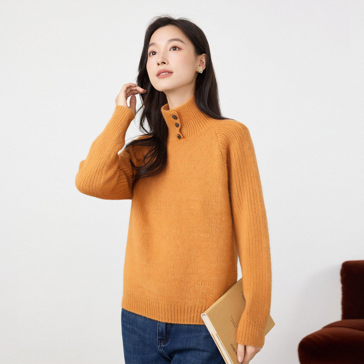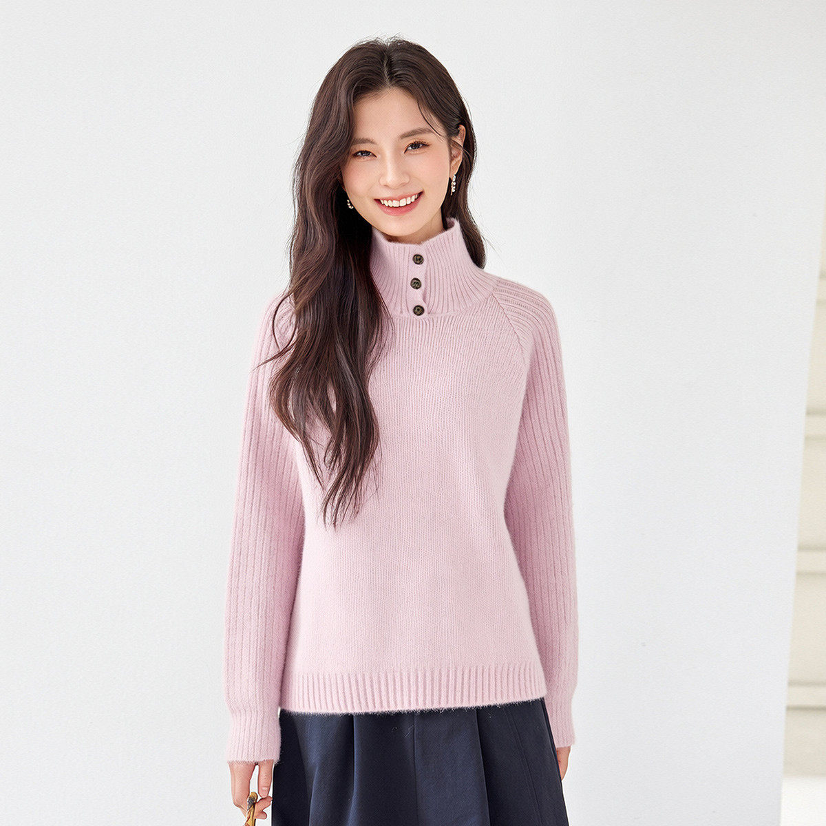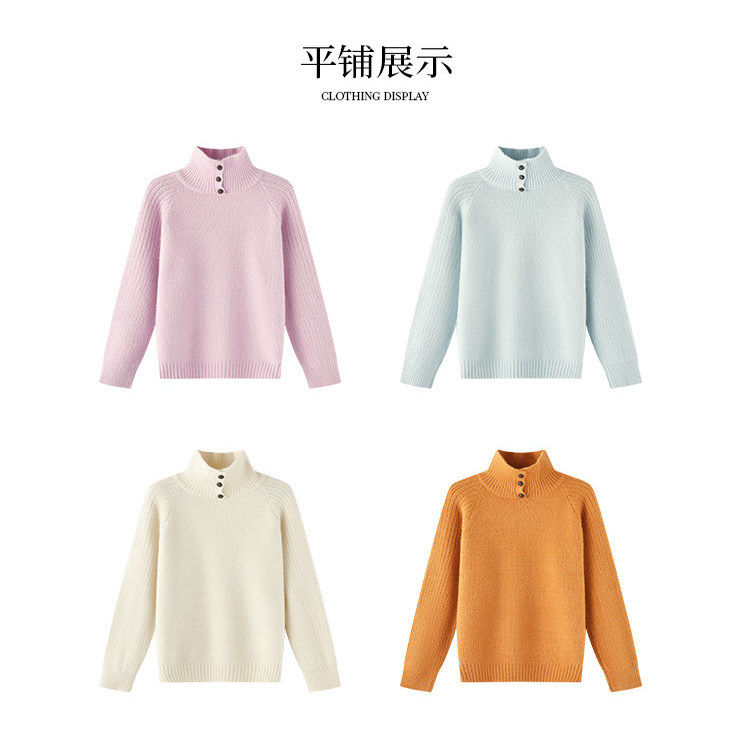 茵曼2025冬季新款纽扣高领宽松长袖针织衫女休闲时尚上衣打底毛衣
