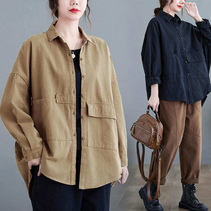 全棉衬衫女春秋季宽松大码纯色拼接大口袋休闲工装衬衣长袖外套潮