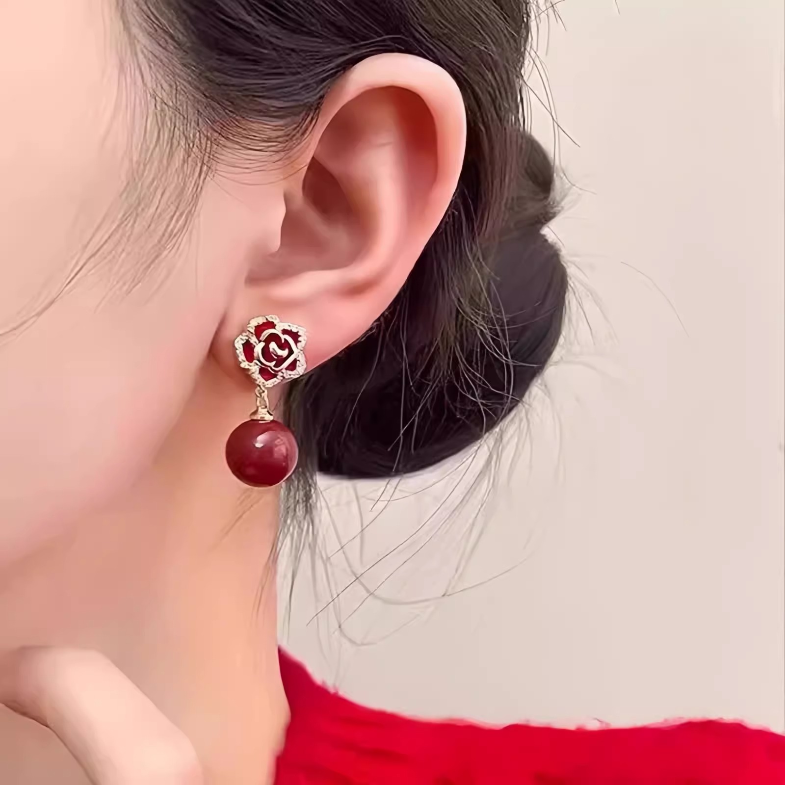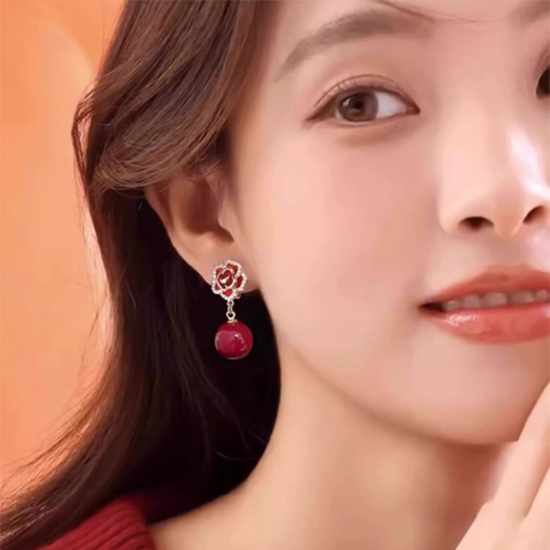 S925纯银玫瑰花朱砂耳钉本命年2025蛇过新年耳环高级感红色耳饰女
