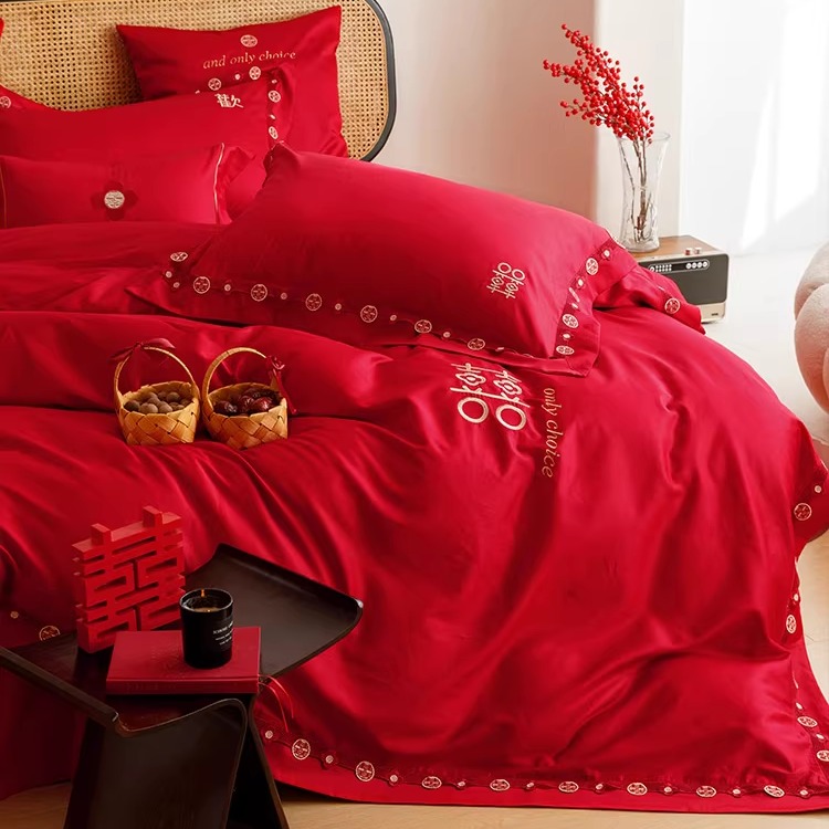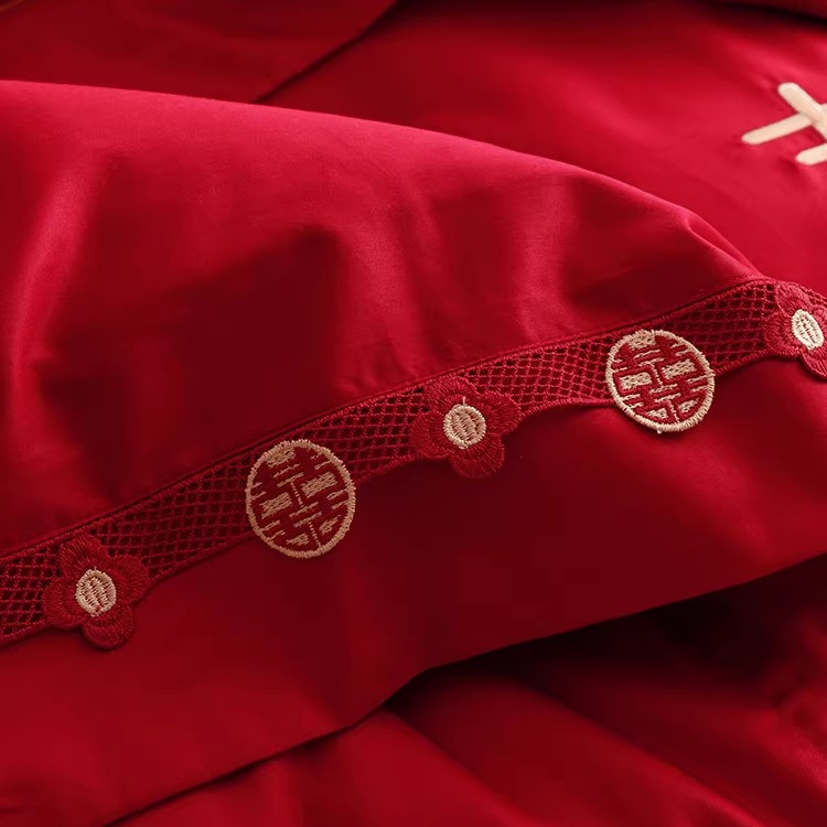 现代风婚庆100支长绒棉全棉四件套刺绣大红纯棉被套床上用品结婚