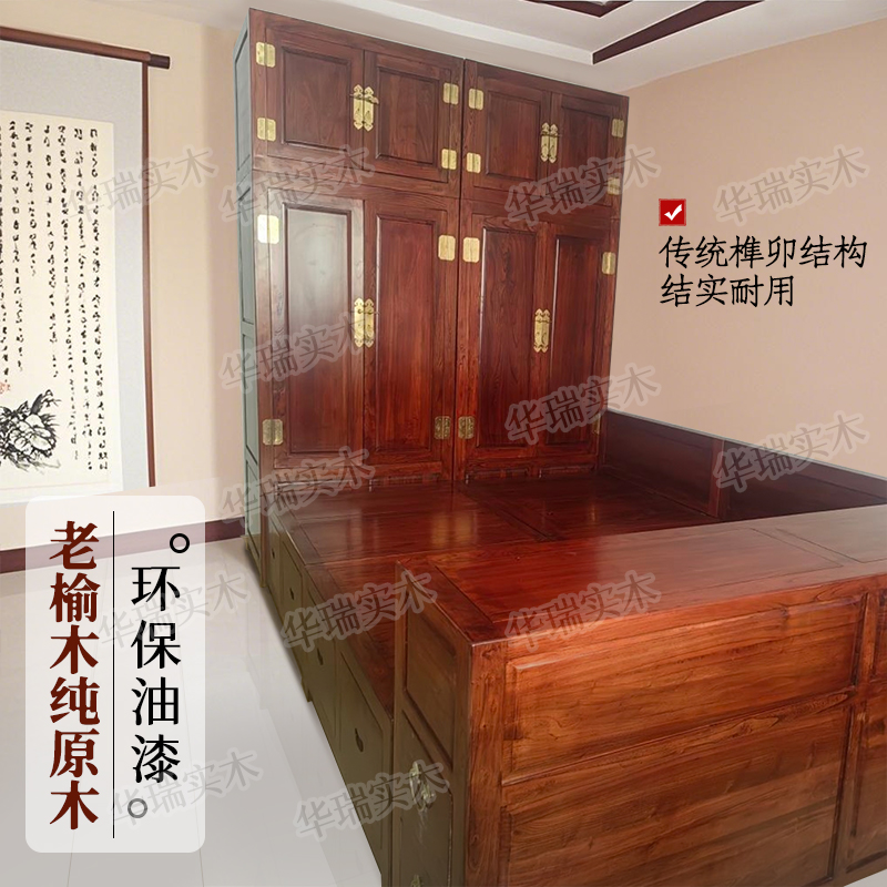 老榆木实木床原木衣柜床一体实木大炕床箱体床组合床柜北方大炕