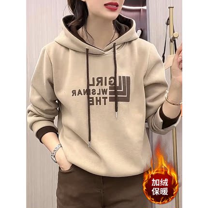 秋冬新款加绒加厚卫衣气质百搭显瘦减龄字母印花连帽套头宽松上衣