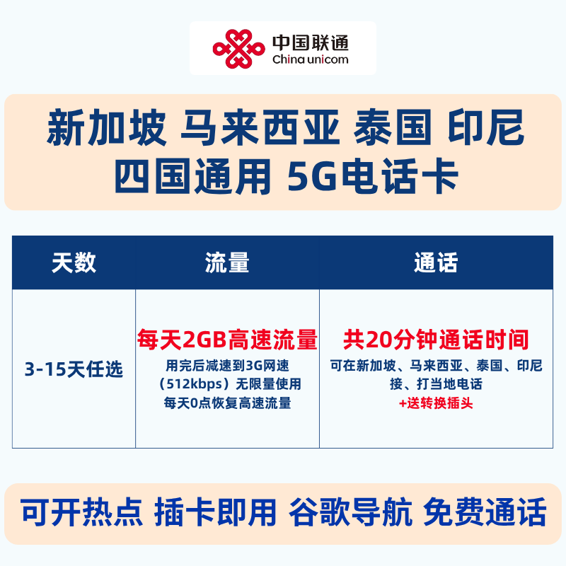 印尼巴厘岛5G电话卡新加坡 马泰通用带通话上网卡高速流量3-15天