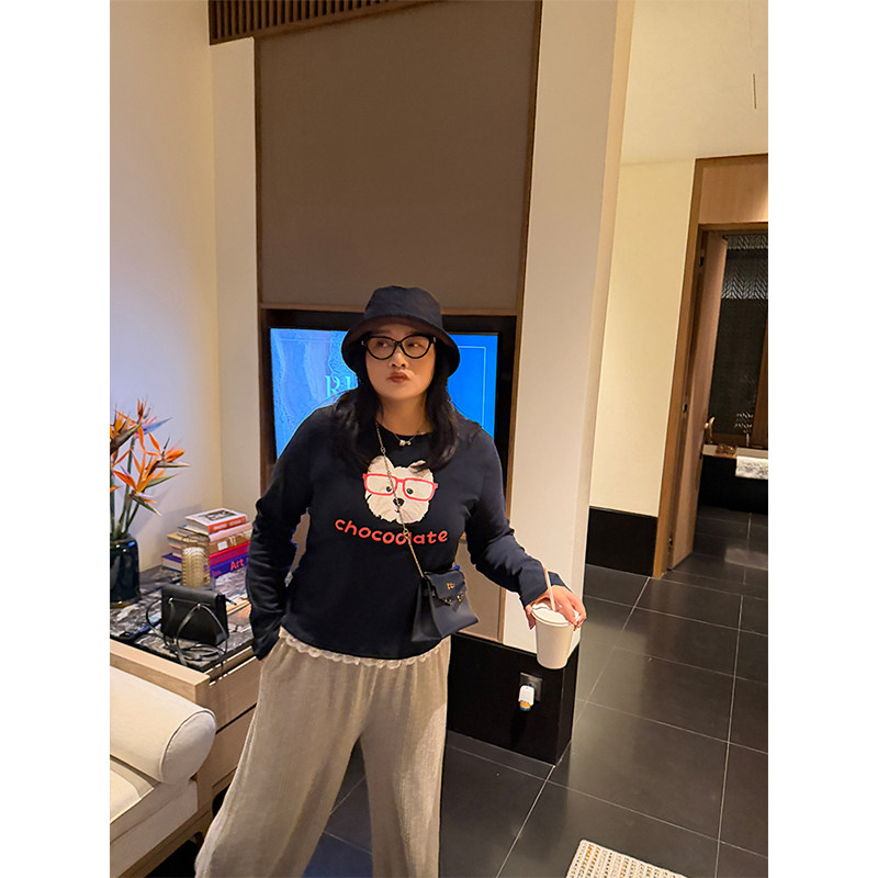 铅笔小鑫大码女装 蕾丝拼接修身显瘦下摆卡通小狗印花长袖T恤