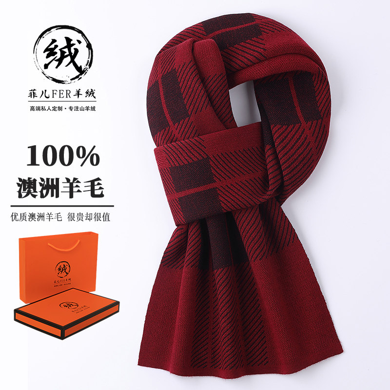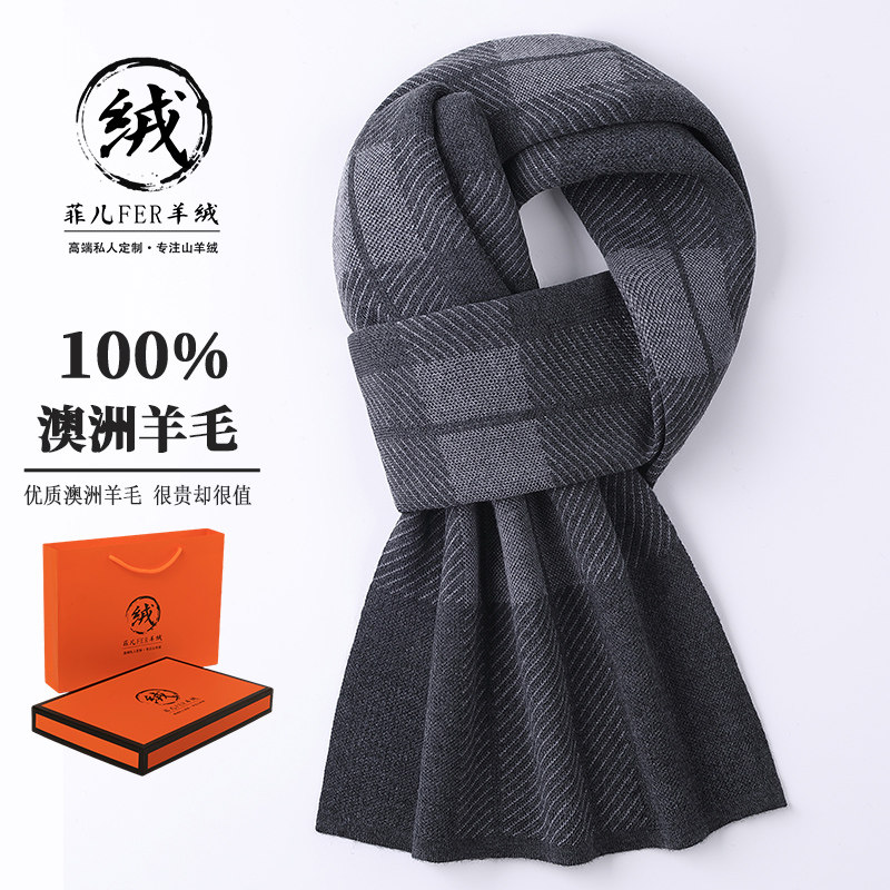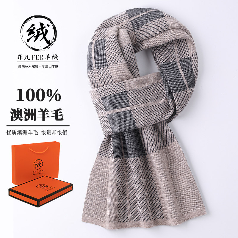 鄂尔多斯市产100%纯羊毛男士格子围巾冬季高档加厚羊绒围脖礼物