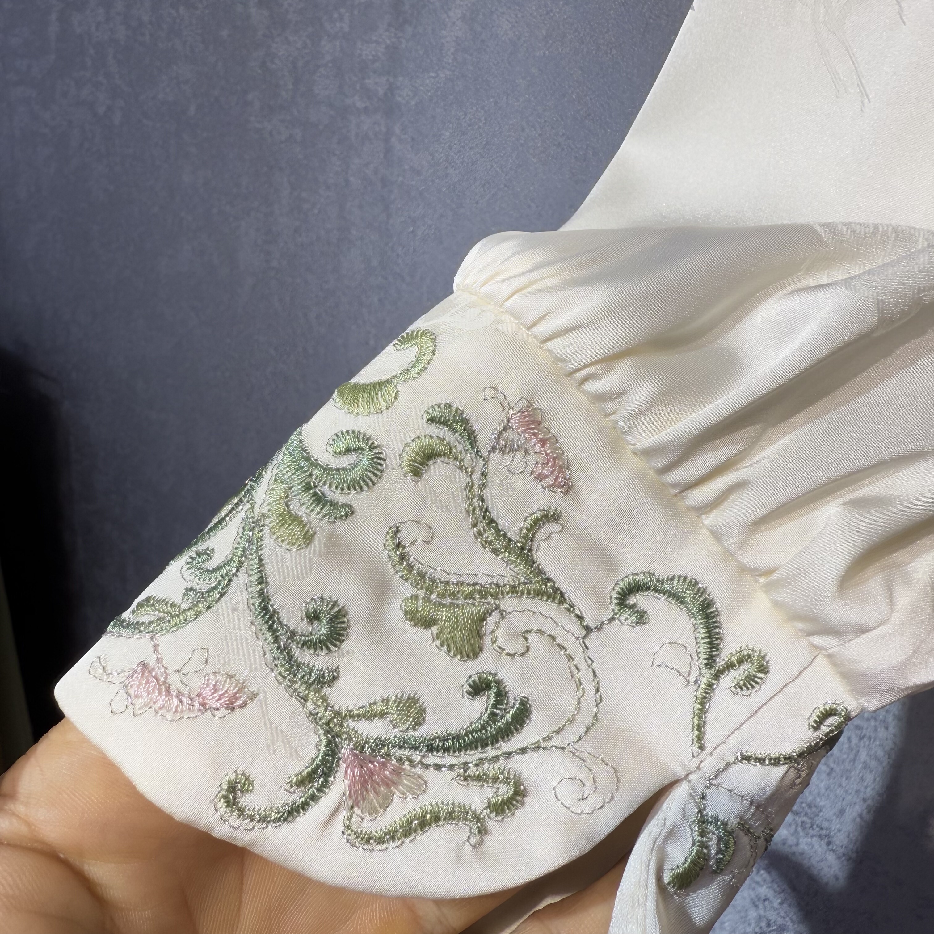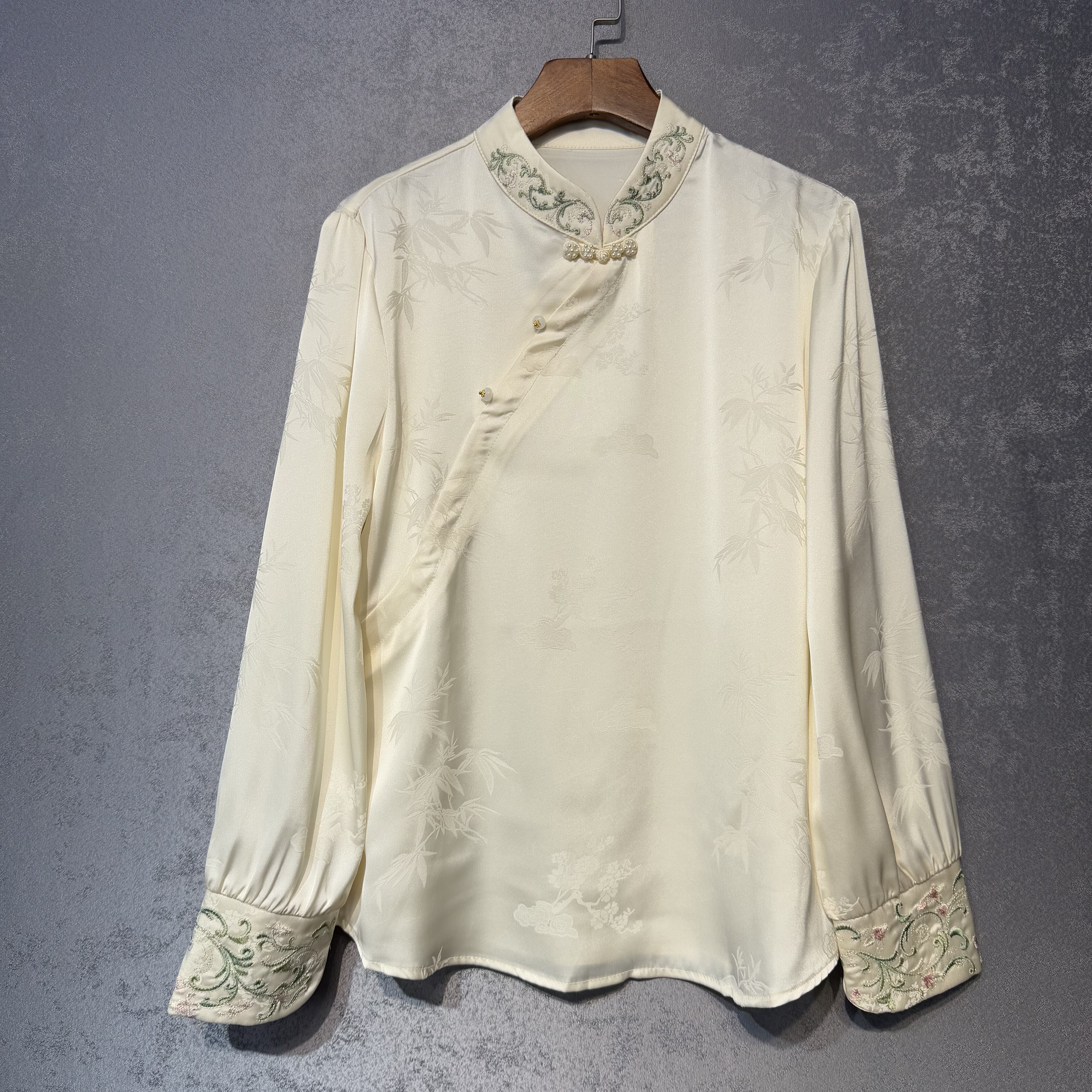 新中式早秋新款国风真丝提花花萝百搭斜门襟盘扣重工刺绣白色衬衫