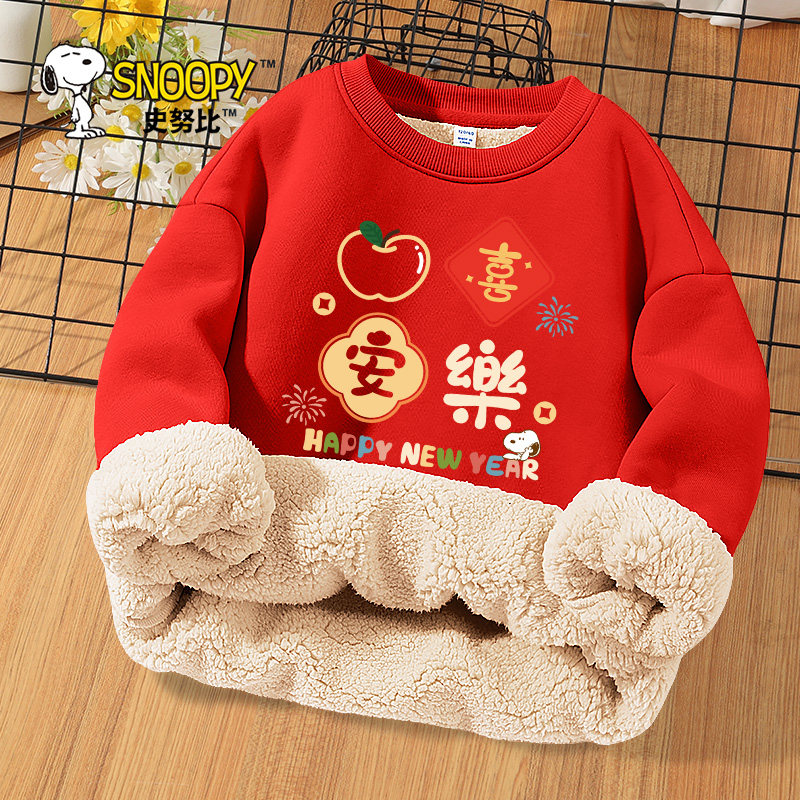 史努比男童红色卫衣男大童本命年羊羔绒衣服儿童冬季加绒套头衫厚